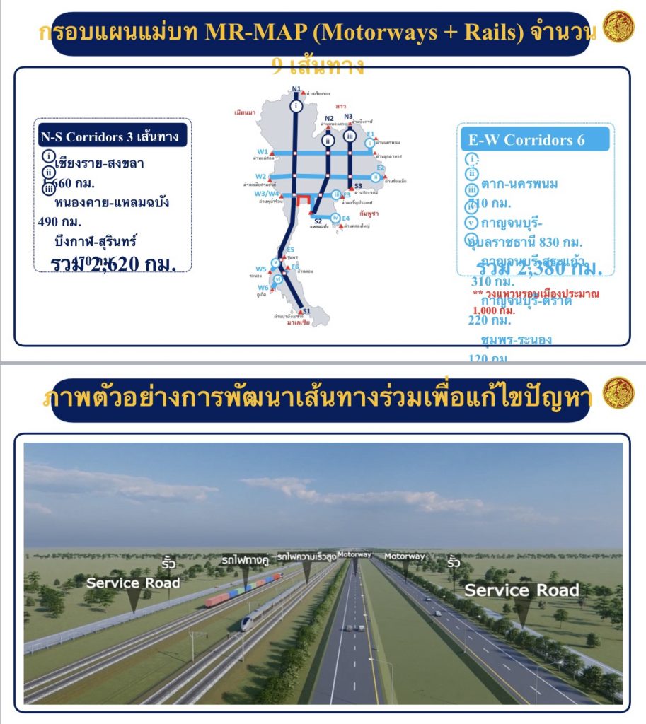 สำหรับแนวเส้นทาง MR-Map 9 เส้นทาง ที่จะใช้งบประมาณจากกองทุนทางหลวงพิเศษระหว่างเมือง มาศึกษา และศึกษาถึงขั้นตอนดำเนินการขั้นตอนการให้เอกขนร่วมลงทุน (PPP) แบ่งเป็นเส้นทางเหนือลงใต้จำนวน 3 เส้นทาง ประกอบด้วย เส้นทางเชียงราย-สงขลา, เส้นทาง หนองคาย-ท่าเรือแหลมฉบัง และเส้นทางบึงกาฬ-สุรินทร์ รวมระยะเส้นทางรวมทั้งหมด 2620 กิโลเมตร ,