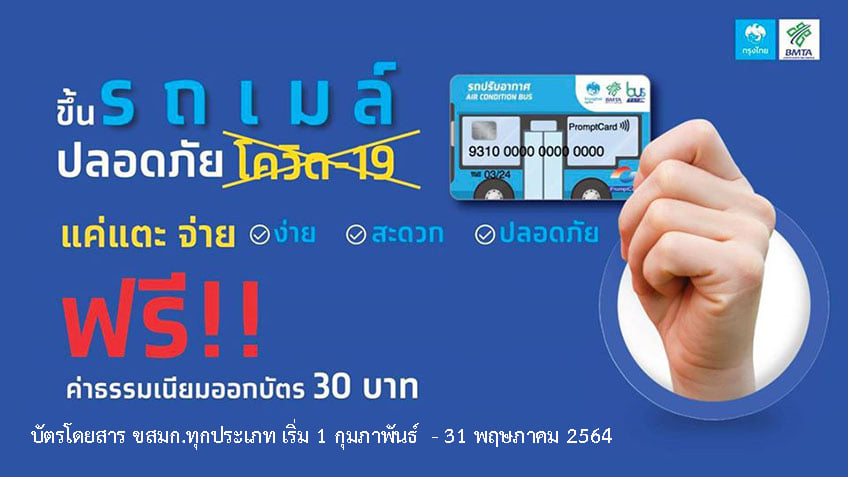 องค์การขนส่งมวลชนกรุงเทพ (ขสมก.) เตรียมยกเลิกการเก็บค่าธรรมเนียมในการออกบัตรโดยสารล่วงหน้าอิเล็กทรอนิกส์ บุคคลทั่วไป และบัตรโดยสารนักเรียน นิสิต นักศึกษา อิเล็กทรอนิกส์ ใบละ 30 บาท ตั้งแต่วันที่ 1 กุมภาพันธ์ ถึงวันที่ 31 พฤษภาคม 2564 เพื่อส่งเสริมให้ประชาชนผู้ใช้บริการ เปลี่ยนวิธีการชำระค่าโดยสารจากเดิมที่ใช้เงินสด เป็นการชำระค่าโดยสารผ่านบัตรดังกล่าว เพื่อลดการสัมผัสเหรียญกษาปณ์ และธนบัตร ซึ่งเป็นสื่อแพร่เชื้อไวรัสโคโรนา 2019 (COVID – 19)