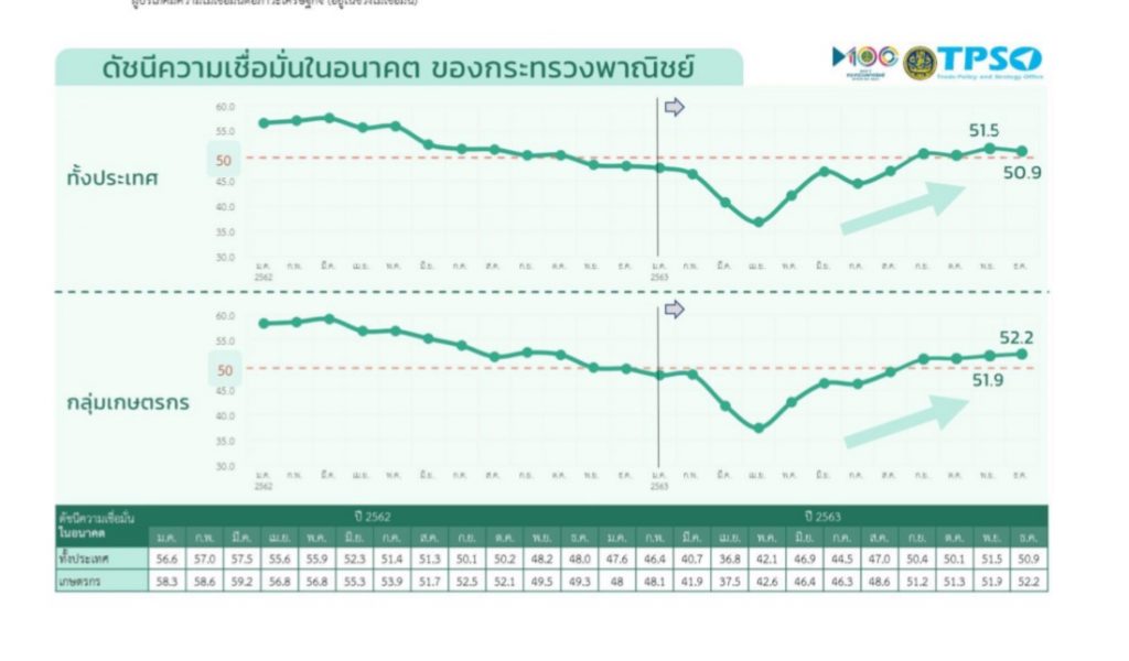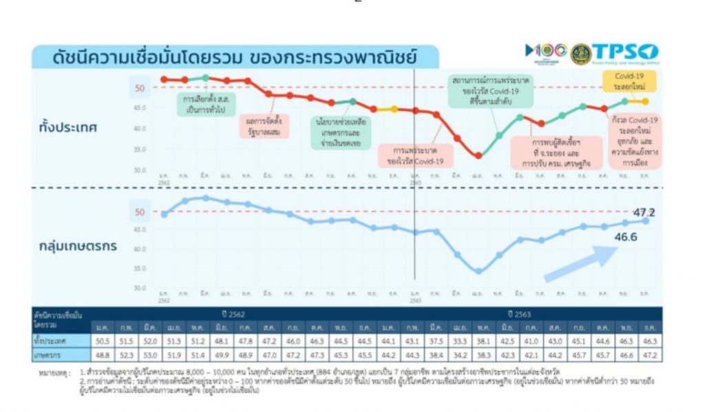 นายจุรินทร์ ลักษณวิศิษฏ์ หัวหน้าพรรคประชาธิปัตย์ รองนายกรัฐมนตรีและรัฐมนตรีว่าการกระทรวงพาณิชย์ เปิดเผยว่า กระทรวงพาณิชย์โดย โดยสำนักงานนโยบายและยุทธศาสตร์การค้า TPSO (Trade Policy and Strategy Office) ได้สำรวจและรายงานความเชื่อมั่นเกษตรกรปี 63 ว่ามีการฟื้นตัวอย่างต่อเนื่อง แม้ว่าปี 2563 เป็นปีที่เราประสบปัญหาหลายด้านต่อเนื่องจากปี 2562 ทั้งสงครามการค้า การถดถอยของเศรษฐกิจโลก และการแพร่ระบาดของไวรัสโควิด-19 ซึ่งเริ่มระบาดในเดือนธันวาคม 2562 และส่งผลชัดเจนต่อไทยในช่วง 4 เดือนแรกของปี 2563