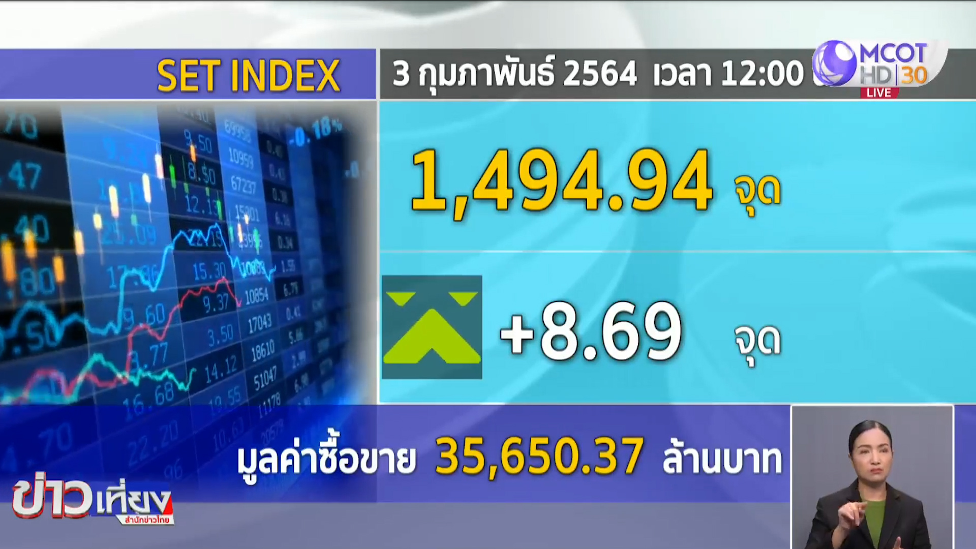 3 ก.พ.-ตลาดหุ้นไทยเช้านี้สดใสตามทิศทางต่างประเทศ และราคาน้ำมันดิบขยับขึ้น ล่าสุด บวก 8.69 จุด ที่ 1,494.94 จุด มูลค่าซื้อขาย 35,650.37 ล้านบาท