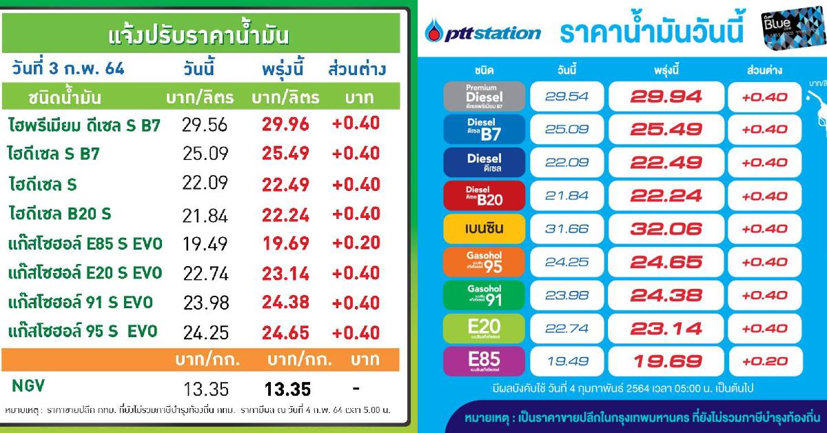 PTT Station บางจากฯปรับราคาขายปลีกน้ำมันทุกชนิดขึ้น 0.40 บาทต่อลิตร เว้น E85 ปรับขึ้น 0.20 บาทต่อลิตร มีผล 4 กพ. 2564 เวลา 05.00 น. เป็นต้นไป โดยราคาขายปลีกจะเป็นดังนี้ ULG = 32.06, GSH95 = 24.65, E20 = 23.14, GSH91 = 24.38, E85 = 19.69, HSD- B7= 25.49, HSD-B10 = 22.49, HSD-B20 = 22.24, ดีเซลพรีเมี่ยม B7 = 29.94 บาทต่อลิตร โดยราคาขายปลีกข้างต้น ยังไม่รวมภาษีบำรุงกรุงเทพมหานคร.-สำนักข่าวไทย