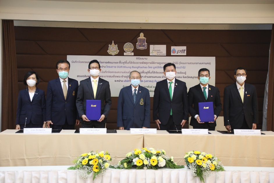 นายจตุพร บุรุษพัฒน์ ปลัดกระทรวงทรัพยากรธรรมชาติและสิ่งแวดล้อม เปิดเผยว่า เมื่อเร็วๆนี้ ได้มีพิธีลงนามบันทึกข้อตกลง (MOU) 2 ฉบับ ประกอบด้วย บันทึกข้อตกลงความร่วมมือการพัฒนาและฟื้นฟูพื้นที่สีเขียวราชพัสดุภายใต้การดูแลของกรมป่าไม้ (โครงการสวนกลางมหานคร) อำเภอพระประแดง จังหวัดสมุทรปราการ ระหว่าง โครงการ OUR Khung BangKachao โดยมูลนิธิชัยพัฒนา กับกรมป่าไม้ และ บันทึกข้อตกลงความร่วมมือโครงการฟื้นฟูพื้นที่สีเขียวและบริหารจัดการเรียนรู้ สวนเฉลิมพระเกียรติพระบาทสมเด็จพระเจ้าอยู่หัว 80 พรรษา ต.ทรงคนอง อ.พระประแดง จ.สมุทรปราการ ระหว่าง กรมป่าไม้ กับ บมจ. ปตท. โดยช่วง 2 ปี ที่ผ่านมา โครงการฯ ได้เข้ามาพัฒนาพื้นที่ราชพัสดุในคุ้งบางกะเจ้าอย่างต่อเนื่อง ซึ่งพื้นที่ราชพัสดุในคุ้งบางกะเจ้า คิดเป็นพื้นที่เพียงร้อยละ 10 ของพื้นที่คุ้งบางกะเจ้า ส่วนที่เหลือต้องได้รับความร่วมมือร่วมใจจากภาคเอกชน องค์กรปกครองส่วนท้องถิ่น และประชาชนในพื้นที่ที่เป็นเจ้าของช่วยกันอนุรักษ์พื้นที่แห่งนี้ ที่เป็นเสมือนปอดกลางกรุงที่ดีที่สุดของเอเชียเอาไว้ให้เป็นพื้นที่สีเขียวอย่างยั่งยืน