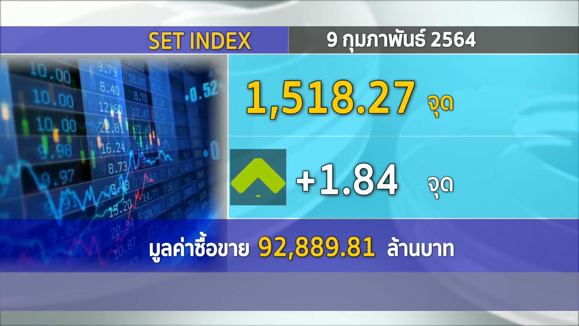 ตลาดหลักทรัพย์ปิดวันนี้ที่ระดับ 1,518.27 จุด เพิ่มขึ้น 1.84 จุด (+0.12%) มูลค่าการซื้อขาย 92,889.81 ล้านบาท ดัชนีหุ้นไทยเคลื่อนไหวในแดนบวกตลอดทั้งวัน โดยดัชนีทำระดับสูงสุดที่ 1,529.49 จุด และทำระดับต่ำสุดที่ 1,516.50 จุดส่วนหลักทรัพย์เปลี่ยนแปลงวันนี้ เพิ่มขึ้น 752 หลักทรัพย์ ลดลง 793 หลักทรัพย์ และไม่เปลี่ยนแปลง 477 หลักทรัพย์ .-สำนักข่าวไทย
