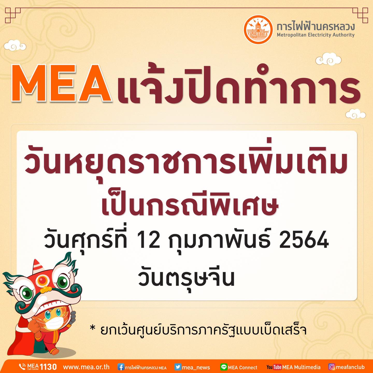 การไฟฟ้านครหลวง หรือ MEA จึงประกาศปิดทำการทุกแห่ง ยกเว้นเคาน์เตอร์ที่ศูนย์บริการภาครัฐแบบเบ็ดเสร็จ (Government Center) 3 แห่ง ที่เปิดทำการพร้อมให้บริการชำระค่าไฟฟ้าปกติ ได้แก่ ศูนย์การค้าเซ็นทรัลพลาซาเวสต์เกต โซน Fashion ชั้น 1 เซ็นทรัลแจ้งวัฒนะ บริเวณชั้น 3 และห้างสรรพสินค้าเดอะมอลล์งามวงศ์วานบริเวณชั้น 5 ระหว่างเวลา 11.00–17.00 น. ทั้งนี้ MEA จะเปิดทำการและให้บริการตามปกติ ในวันจันทร์ที่ 15 กุมภาพันธ์ 2564 ระหว่างเวลา 07.30–15.00 น.