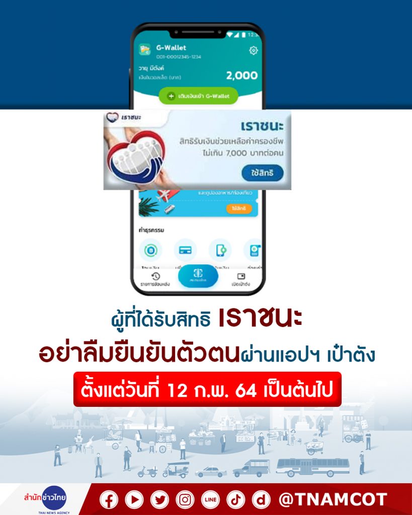 12 ก.พ.-ธนาคารกรุงไทย Krungthai Care โพสต์ขั้นตอนยืนยันตัวตน “เราชนะ” ด้วย 5 ขั้นตอนง่ายๆ เพื่อรับวงเงิน และเริ่มใช้สิทธิโครงการฯ ได้ตั้งแต่วันที่ 5 กุมภาพันธ์ – 31 พฤษภาคม 2564