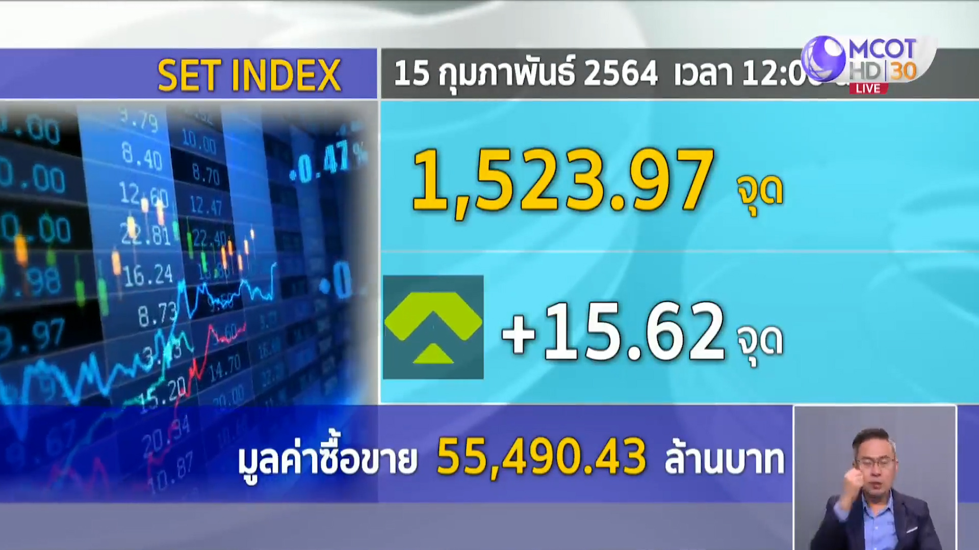 กรุงเทพฯ 15 ก.พ.-ตลาดหุ้นไทยช่วงเช้าได้จากแรงหนุนความคาดหวังสหรัฐจะเร่งออกมาตรการกระตุ้นเศรษฐกิจรอบใหม่ ราคาน้ำมันดิบที่พุ่งขึ้น แม้จีดีพีของไทยจะติดลบมากก็ตาม ดัชนีช่วงเที่ยงอยู่ที่ 1,523.97 จุด เพิ่มขึ้น 15.62 จุด มูลค่าการซื้อขาย 55,490.43 ล้านบาท