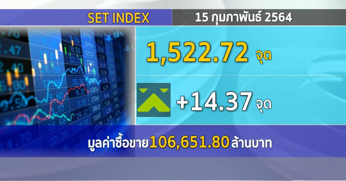กทม. 15 ก.พ.-ตลาดหลักทรัพย์ปิดวันนี้ที่ระดับ 1,522.72 จุด เพิ่มขึ้น 14.37 จุด (+0.95%) มูลค่าการซื้อขาย 106,651.80 ล้านบาท ตามต่างประเทศ คาดหวังมาตรการกระตุ้นเศรษฐกิจสหรัฐฯ หนุน GDP โต