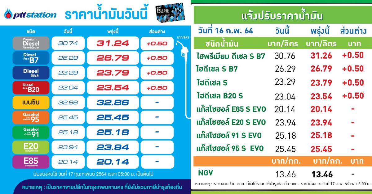 PTT Station-บางจากฯ ปรับราคาขายปลีกน้ำมันกลุ่มดีเซลทุกชนิดขึ้น 0.50 บาทต่อลิตร ส่วนกลุ่มเบนซินและแก๊สโซฮอล์ทุกชนิด คงเดิม มีผล 17 ก.พ.64 เวลา 05.00 น. เป็นต้นไป โดยราคาขายปลีกจะเป็นดังนี้