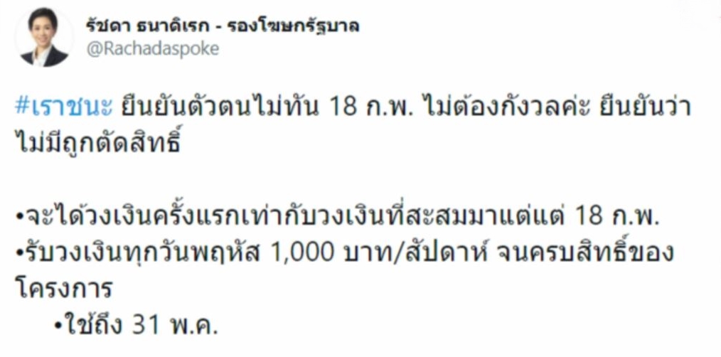 ขณะที่ทวิตเตอร์ของ น.ส.รัชดา ธนาดิเรก รองโฆษกประจำสำนักนายกรัฐมนตรี ได้ทวีตข้อความยืนยันว่า หากกดยืนยันตัวตน มาตรการ “เราชนะ” ไม่ทันวันที่ 18 กุมภาพันธ์ “จะไม่ถูกตัดสิทธิ” โดยจะได้วงเงินครั้งแรกหลังกดยืนยันตัวตนเท่ากับวงเงินที่สะสมมาจากวันที่ 18 กุมภาพันธ์ 2564. – สำนักข่าวไทย