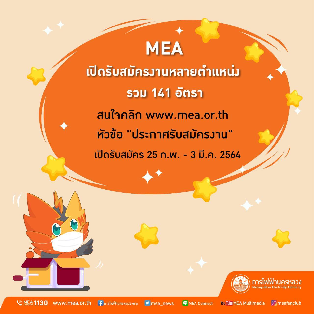 เปิดรับสมัคร 25 ก.พ. – 3 มี.ค. 2564 ผ่านช่องทางออนไลน์ตลอด 24 ชั่วโมง ไม่เว้นวันหยุดราชการ สนใจสมัครได้ที่เว็บไซต์ MEA หัวข้อ “ประกาศรับสมัครงาน” หรือ คลิก https://www.mea.or.th/job