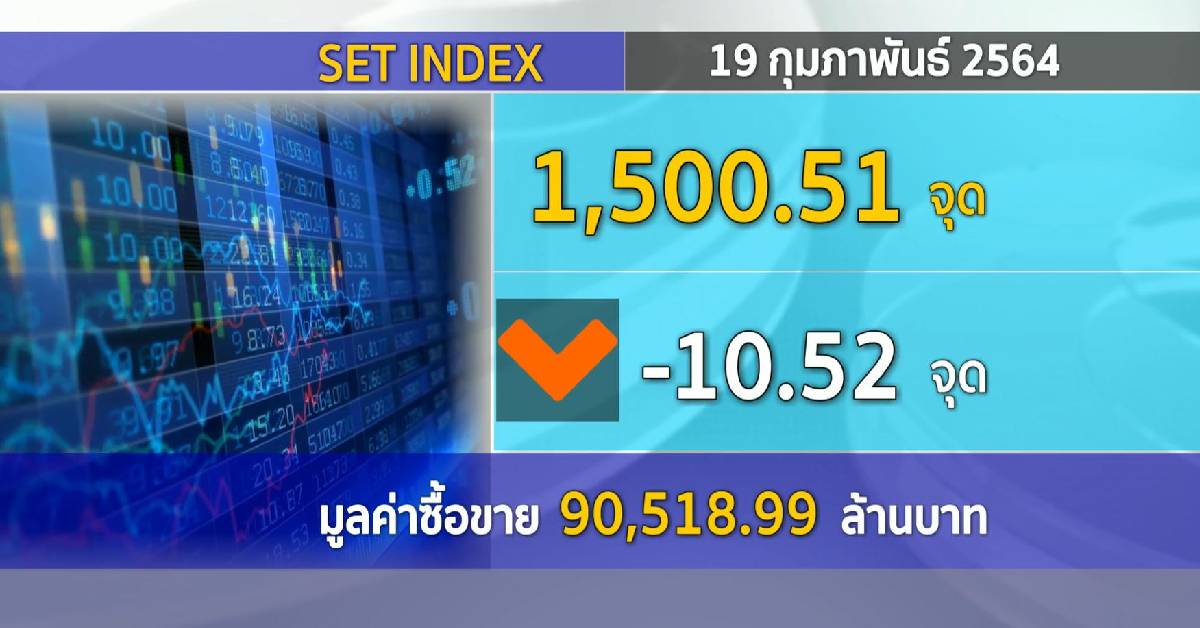 กทม. 19 ก.พ.-ตลาดหลักทรัพย์ปิดวันนี้ที่ระดับ ปิดวันนี้ที่ระดับ 1,500.51 จุด ลดลง 10.52 จุด (-0.70%) มูลค่าการซื้อขาย 90,518.99 ล้านบาท สอดคล้องตลาดต่างประเทศ จากแรงขายหุ้นบิ๊กแคป