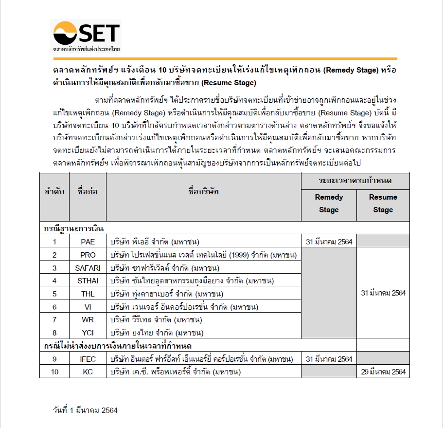 ตามที่ตลาดหลักทรัพย์ฯ ได้ประกาศรายชื่อบริษัทจดทะเบียนที่เข้าข่ายอาจถูกเพิกถอนและอยู่ในช่วงแก้ไขเหตุเพิกถอน (Remedy Stage) หรือดำเนินการให้มีคุณสมบัติเพื่อกลับมาซื้อขาย (Resume Stage)