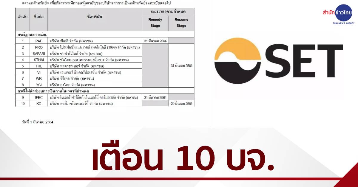 บัดนี้ มีบริษัทจดทะเบียน 10 บริษัทที่ใกล้ครบกำหนดเวลาดังกล่าวแล้ว ตลาดหลักทรัพย์ฯ จึงขอแจ้งให้บริษัทจดทะเบียนดังกล่าวเร่งแก้ไขเหตุเพิกถอนหรือให้มีคุณสมบัติเพื่อกลับมาซื้อขาย