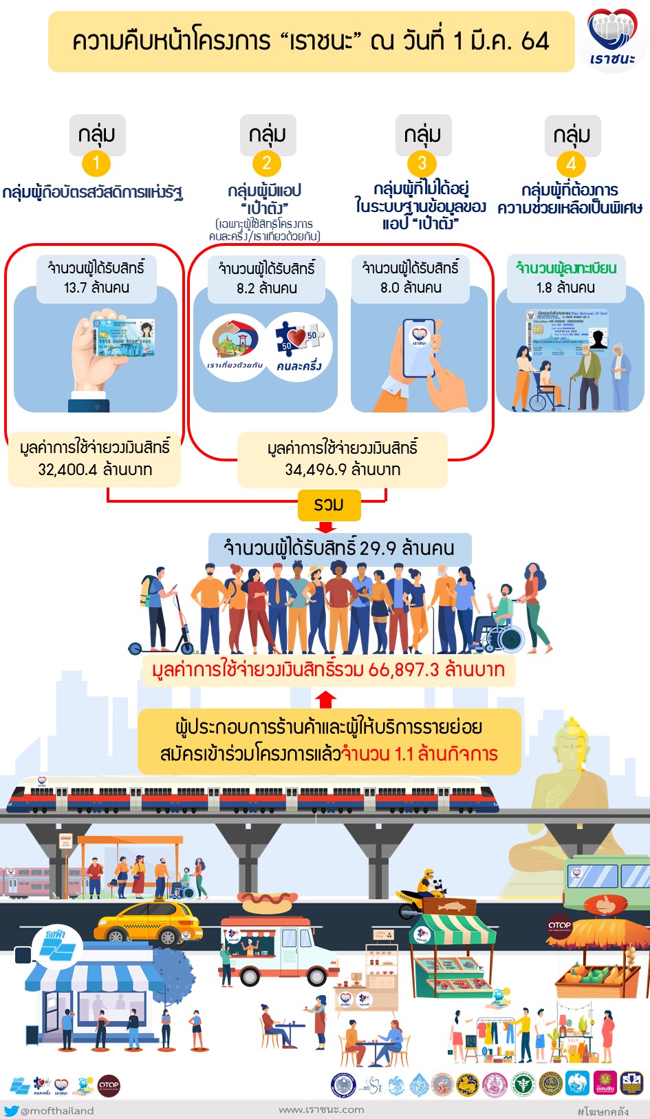สำหรับความคืบหน้าของโครงการฯ ณ วันที่ 1 มีนาคม 2564 มีดังนี้ ประชาชนกลุ่มผู้ที่ต้องการความช่วยเหลือเป็นพิเศษได้ลงทะเบียนเข้าร่วมโครงการฯ ตั้งแต่วันที่ 15 กุมภาพันธ์ 2564 จนถึงปัจจุบันแล้ว จำนวน 1.8 ล้านคน สำหรับประชาชนกลุ่มผู้ถือบัตรสวัสดิการแห่งรัฐ จำนวน 13.7 ล้านคน ได้มีการใช้จ่ายตั้งแต่วันที่ 5 กุมภาพันธ์ 2564 เป็นต้นมา จำนวน 32,400.4 ล้านบาท สำหรับประชาชนกลุ่มที่อยู่ในระบบฯ และกลุ่มประชาชนทั่วไปฯ ที่ผ่านการคัดกรองคุณสมบัติเบื้องต้นและยืนยันการใช้สิทธิร่วมโครงการฯ แล้ว มีจำนวนมากกว่า 16.2 ล้านคน และมีการใช้จ่ายวงเงินสิทธิสะสมตั้งแต่วันที่ 18 กุมภาพันธ์ 2564 เป็นต้นมา จำนวน 34,496.9 ล้านบาท รวมมีผู้ใช้สิทธิโครงการฯ ทั้งสิ้นจำนวน 29.9 ล้านคน คิดเป็นมูลค่าการใช้จ่ายหมุนเวียนในระบบเศรษฐกิจไทยแล้วกว่า 66,897.3 ล้านบาท ซึ่งเป็นการใช้จ่ายผ่านผู้ประกอบการร้านธงฟ้าราคาประหยัดพัฒนาเศรษฐกิจท้องถิ่นที่มีแอปพลิเคชัน “ถุงเงิน” (ร้านธงฟ้าฯ) ร้านค้าคนละครึ่งที่ตกลงยินยอมเข้าร่วมโครงการฯ รวมถึงผู้ประกอบการร้านค้าและผู้ให้บริการที่เข้าร่วมโครงการฯ ที่ลงทะเบียนเข้าร่วมโครงการฯ จำนวนมากกว่า 1.1 ล้านกิจการ โดยส่วนใหญ่เป็นวงเงินสิทธิผ่านร้านธงฟ้าฯ ร้านค้าทั่วไปและอื่นๆ และร้านอาหารและเครื่องดื่ม ตามลำดับ. – สำนักข่าวไทย