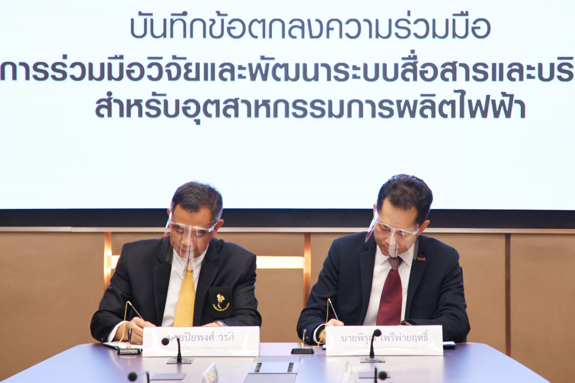 นายปิยพงศ์ วรกี ผู้อำนวยการฝ่ายจัดการและพัฒนาระบบสารสนเทศ การไฟฟ้าฝ่ายผลิตแห่งประเทศไทย (กฟผ.) พร้อมด้วย นายพิรุณ ไพรีพ่ายฤทธิ์ หัวหน้าคณะทำงานและกรรมการยุทธศาสตร์ 5G บมจ.ทรู คอร์ปอเรชั่น ร่วมลงนาม MOU โครงการวิจัยและพัฒนาระบบสื่อสารและบริการ 5G สำหรับอุตสาหกรรมการผลิตไฟฟ้า ระหว่าง การไฟฟ้าฝ่ายผลิตแห่งประเทศไทย (กฟผ.) และ กลุ่มทรู โดยจะร่วมศึกษาและพัฒนาการนำโครงข่ายและอุปกรณ์ที่รองรับระบบ 5G มาทดสอบใช้งานที่ กฟผ. แม่เมาะ จ.ลำปาง เพื่อยกระดับอุตสาหกรรมผลิตไฟฟ้าในยุคดิจิทัล โดยมีนายบุญญนิตย์ วงศ์รักมิตร ผู้ว่าการ กฟผ. และนายพิชิต ธันโยดม หัวหน้าคณะผู้บริหาร ด้านธุรกิจองค์กร บมจ.ทรู คอร์ปอเรชั่น ร่วมเป็นสักขีพยาน ณ อาคาร 50 ปี กฟผ. สำนักงานใหญ่ กฟผ. อ.บางกรวย จ.นนทบุรี