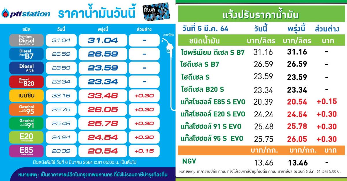 ราคาใหม่มีดังนี้ เบนซิน อยู่ที่ 33.46 บาท/ลิตร, แก๊สโซฮอล์95 อยู่ที่ 26.05 บาท/ลิตร, แก๊สโซฮอล์91 อยู่ที่ 25.78 บาท/ลิตร, E20 อยู่ที่ 24.54 บาท/ลิตร, E85 อยู่ที่ 20.54 บาท/ลิตร, ดีเซล อยู่ที่ 23.59 บาท/ลิตร, ดีเซล B20 อยู่ที่ 23.34 บาท/ลิตร, ดีเซล B7 อยู่ที่ 26.59 บาท/ลิตร, ดีเซลพลีเมี่ยม B7 อยู่ที่ 31.16 บาท/ลิตร (ราคาดังกล่าวยังไม่รวมภาษีบำรุงท้องที่ กทม.)