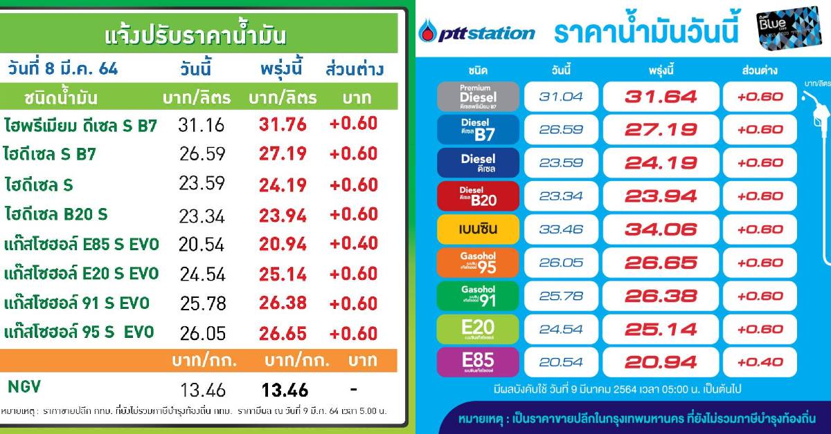 PTT Station บางจากฯ ปรับราคาขายปลีกน้ำมันกลุ่มเบนซินและแก๊สโซฮอล์ทุกชนิดขึ้น 0.60 บาทต่อลิตร เว้น E85 ปรับขึ้น 0.40 บาทต่อลิตร ส่วนกลุ่มดีเซลทุกชนิด ปรับขึ้น 0.60 บาทต่อลิตร มีผล 9 มี.ค.64 เวลา 05.00 น. เป็นต้นไป