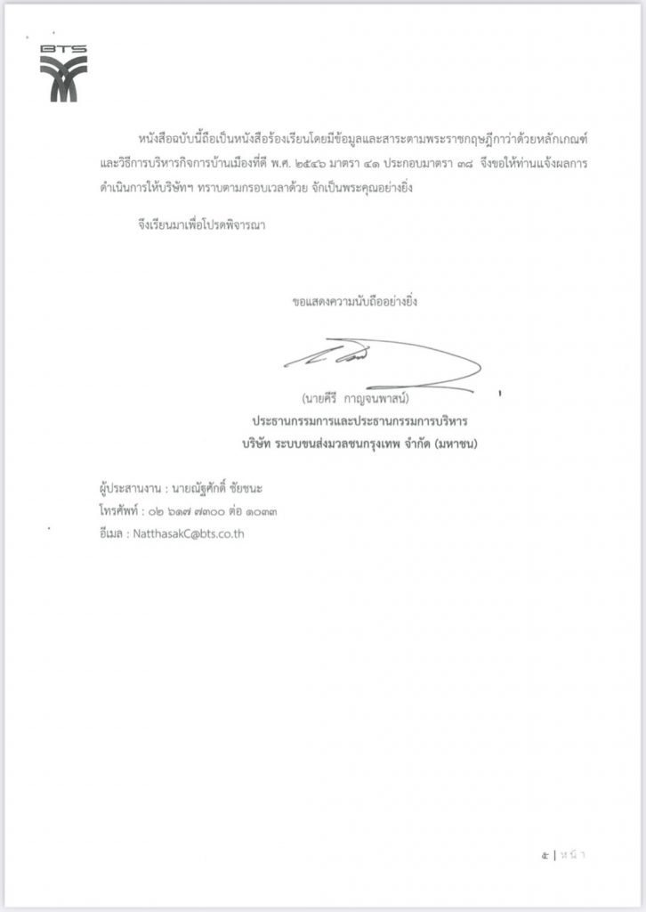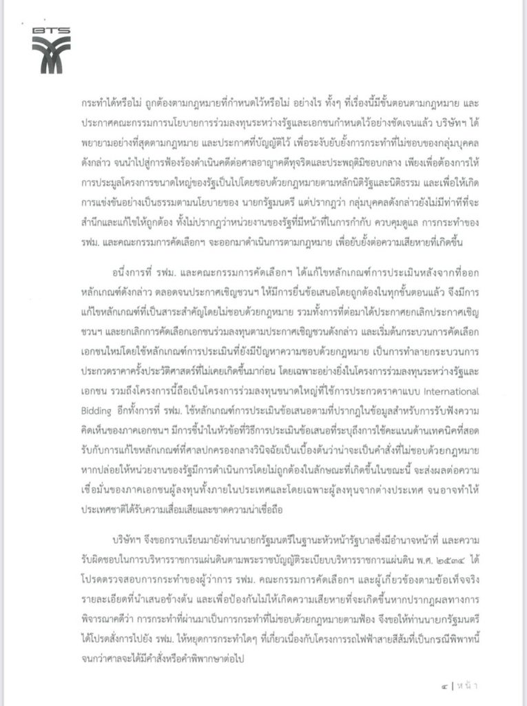 หนังสือดังกล่าว ระบุว่าตามที่การรถไฟฟ้าขนส่งมวลชนแห่งประเทศไทย (รฟม.) และ คณะกรรมการคัดเลือกตามมาตรา 36 แห่งพระราชบัญญัติการร่วมลงทุนระหว่างรัฐและเอกชน พ.ศ. 2526 (“คณะกรรมการคัดเลือกฯ”) ได้ร่วมกันเปลี่ยนแปลงแก้ไขเอกสารสำหรับการคัดเลือกเอกชน เล่มที่ 1 ข้อแนะนำผู้ยื่นข้อเสนอ ของโครงการรถไฟฟ้าสายสีส้ม ช่วงบางขุนนนท์ – มีนบุรี (สุวินทวงศ์) (“โครงการฯ”)โดยออกเอกสารสำหรับการคัดเลือกเอกชนเพิ่มเติมครั้งที่ 1 จนเป็นเหตุให้บีทีเอส มีหนังสือสอบถามและขอความเป็นธรรมถึงบุคคลและหน่วยงานที่เกี่ยวข้องกับโครงการฯ จำนวน 5 ฉบับ แต่ปรากฏว่าบริษัทฯ มิได้รับการชี้แจงในผลการตรวจสอบเกี่ยวกับความไม่เป็นธรรมในการดำเนินโครงการฯ แต่อย่างใด