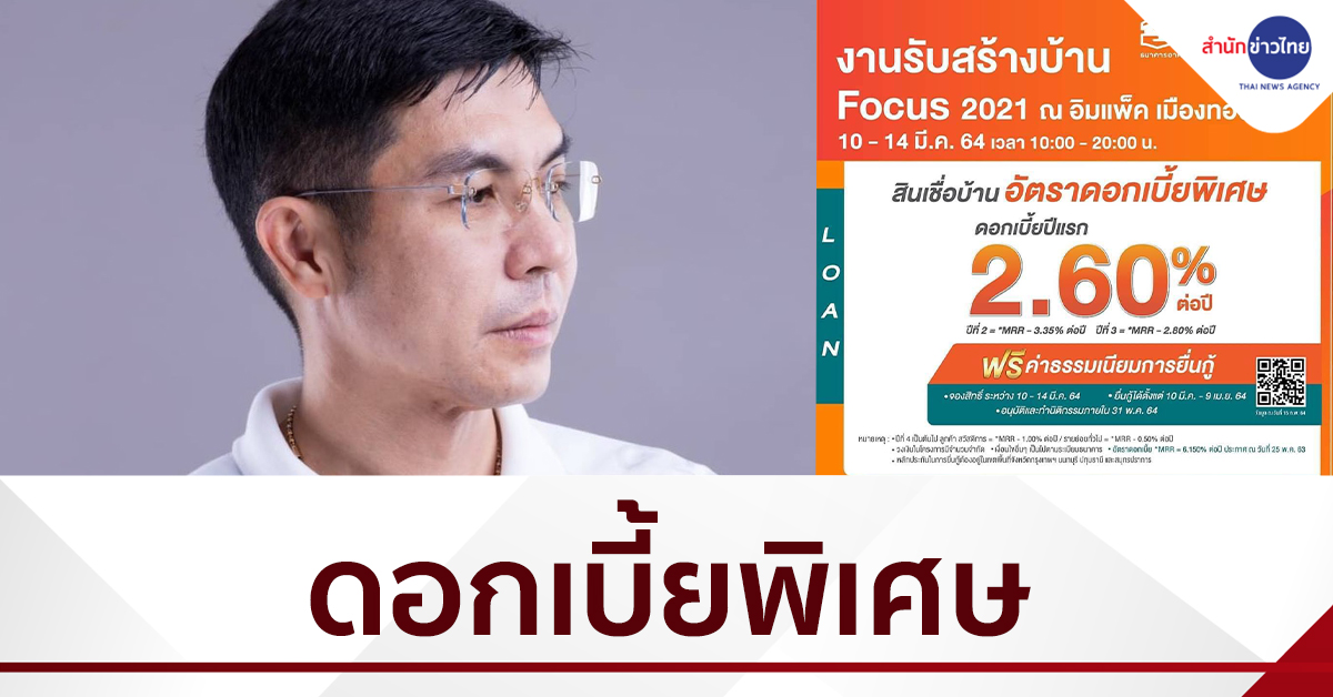 ธนาคารอาคารสงเคราะห์ (ธอส.) ขนผลิตภัณฑ์ทางการเงินให้บริการลูกค้าประชาชนที่ “งานรับสร้างบ้าน Focus 2021” พบกับสินเชื่อบ้านอัตราดอกเบี้ยพิเศษปีแรก 2.60% ต่อปี ดอกเบี้ยเฉลี่ย 3 ปีแรกเพียง 2.917% กรณีกู้ 1 ล้านบาท ผ่อนชำระเริ่มต้นแค่ 3,400 บาท/เดือนเท่านั้น พิเศษ!! ฟรีค่าธรรมเนียมการยื่นกู้ ทางด้านเงินฝากพบกับสลากออมทรัพย์ ธอส. ชุดเกล็ดดาว หน่วยละ 5,000 บาท อายุสลาก 2 ปี ได้ลุ้นรางวัลสูงสุด 1 ล้านบาททุกเดือน และเงินฝากออมทรัพย์ New Flexi for Welfare and Corporate อัตราดอกเบี้ยพิเศษสูงสุด 1.10% ต่อปี จองสิทธิ์ผลิตภัณฑ์ของธนาคารได้ในงานระหว่างวันที่ 10-14 มีนาคม 2564 ณ อิมแพ็ค เมืองทองธานี