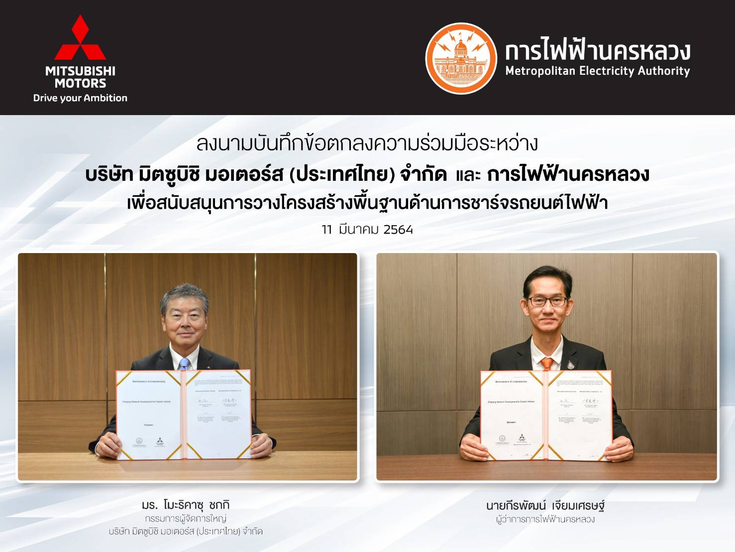 วันนี้ (11 มีนาคม 2564) นายกีรพัฒน์ เจียมเศรษฐ์ ผู้ว่าการการไฟฟ้านครหลวง หรือ MEA ร่วมกับ มร.โมะริคาซุ ชกกิ กรรมการผู้จัดการใหญ่ บริษัท มิตซูบิชิ มอเตอร์ส (ประเทศไทย) จำกัด ลงนามบันทึกข้อตกลงความร่วมมือ (MOU) เพื่อสนับสนุนการวางโครงสร้างพื้นฐานด้านการชาร์จยานยนต์ไฟฟ้า รวมถึงอำนวยความสะดวกในการหาสถานีชาร์จทั่วประเทศ ผ่านแอปพลิเคชัน MEA EV Application สนองนโยบายภาครัฐบาลมุ่งส่งเสริมให้ประชาชนหันมาใช้ยานยนต์ไฟฟ้า (EV)-ยานยนต์ไฟฟ้าแบบปลั๊กอินไฮบริด (PHEV) เพื่อลดมลภาวะทางอากาศ ตอบโจทย์การแก้ปัญหาสิ่งแวดล้อมอย่างยั่งยืน