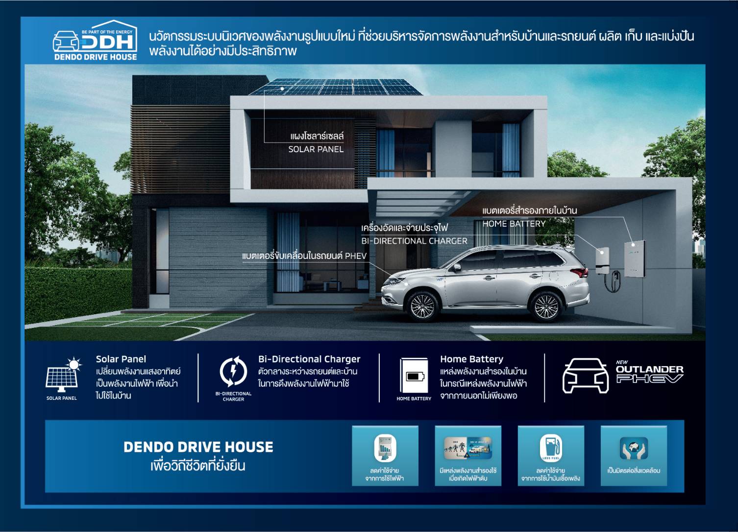 นอกจากนี้ ความร่วมมือดังกล่าวยังรวมถึงการศึกษา พัฒนา และถ่ายทอดองค์ความรู้ร่วมกันเกี่ยวกับเทคโนโลยี V2X (Vehicle to Everything) ที่มีอยู่ในรถยนต์มิตซูบิชิ เอาท์แลนเดอร์ พีเอชอีวี ที่สามารถใช้เป็นแหล่งจ่ายพลังงานได้ด้วยเทคโนโลยี V2H (Vehicle to Home) โดย EV หรือ PHEV จะทำการชาร์จไฟฟ้าเก็บไว้ และทำหน้าที่เป็นแหล่งจ่ายพลังงานไฟฟ้าให้กับครัวเรือนได้เมื่อจอดพัก โดย มิตซูบิชิ มอเตอร์ส ประเทศไทย ได้จัดแสดงระบบนิเวศพลังงานไฟฟ้าแห่งอนาคต “เดนโด ไดร์ฟ เฮ้าส์” (Dendo Drive House) ณ สถาบันการศึกษาและฝึกอบรมของมิตซูบิชิ มอเตอร์ส ประเทศไทย จังหวัดปทุมธานี ถือเป็นการเพิ่มคุณค่าของ EV หรือ PHEV และยังสร้างระบบเครือข่ายพลังงานในอนาคตต่อไป. – สำนักข่าวไทย