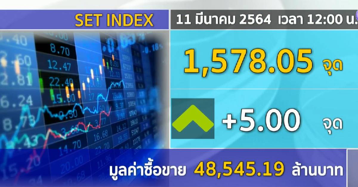 กทม. 11 มี.ค.-หุ้นไทย ดัชนีช่วงเที่ยงอยู่ที่ 1,578.05 จุด เพิ่มขึ้น 5 จุด มูลค่าซื้อขาย 48,545.19 ล้านบาท ได้รับแรงหนุนสภาฯ สหรัฐ อนุมัติมาตรการกระตุ้นเศรษฐกิจ