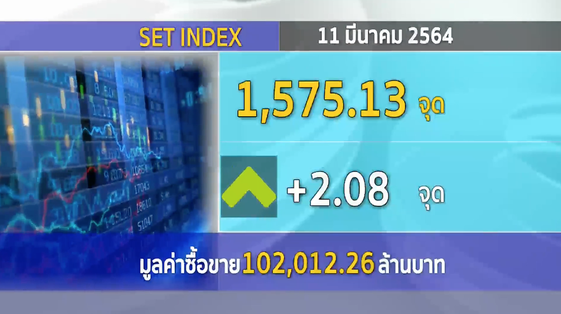 กรุงเทพฯ 11 มี.ค.-ตลาดหลักทรัพย์ปิดวันนี้ที่ระดับ 1,575.13 จุด เพิ่มขึ้น 2.08 จุด (+0.13%) มูลค่าการซื้อขาย 102,012.26 ล้านบาท ผันผวนหลังขึ้นไปเร็ว-ขายลดเสี่ยงกลุ่มหุ้นเอี่ยวกัญชง