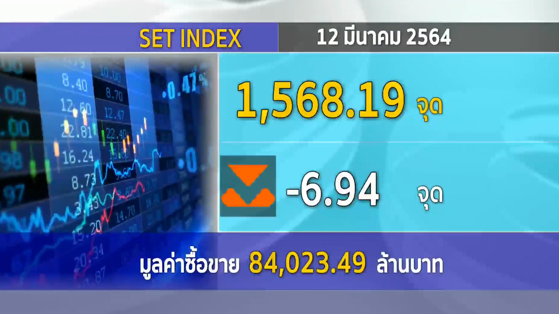 กรุงเทพฯ 12 มี.ค.-ตลาดหลักทรัพย์ปิดวันนี้ที่ระดับ 1,568.19 จุด ลดลง 6.94 จุด (-0.44%) มูลค่าการซื้อขาย 84,023.49 ล้านบาท รับแรงขายทำกำไรผิดหวังเลื่อนฉีดวัคซีน-Bond Yield ดีดตัว
