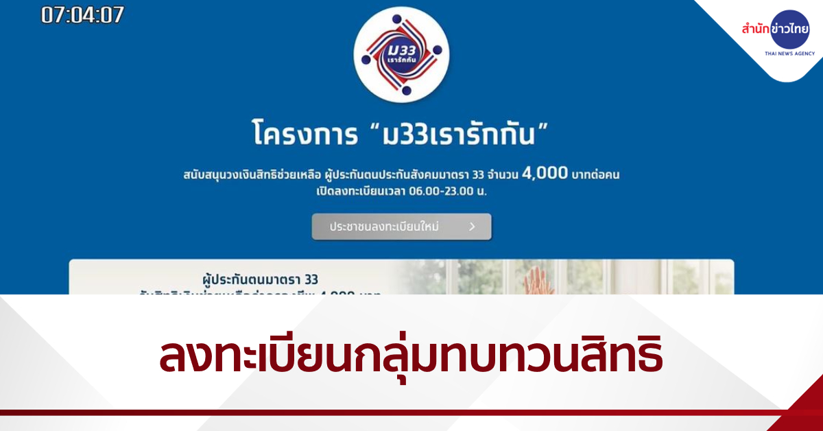 กรุงเทพฯ 15 มี.ค. – วันนี้ (15 มี.ค.) เปิดให้ลงทะเบียน “ม.33 เรารักกัน” กลุ่มทบทวนสิทธิ วันแรก ส่วนกลุ่มไม่มีสมาร์ทโฟน สามารถเดินทางไปลงทะเบียนที่สำนักงานประกันสังคมทุกแห่งทั่วประเทศ โดยใช้บัตรประชาชนใบเดียว