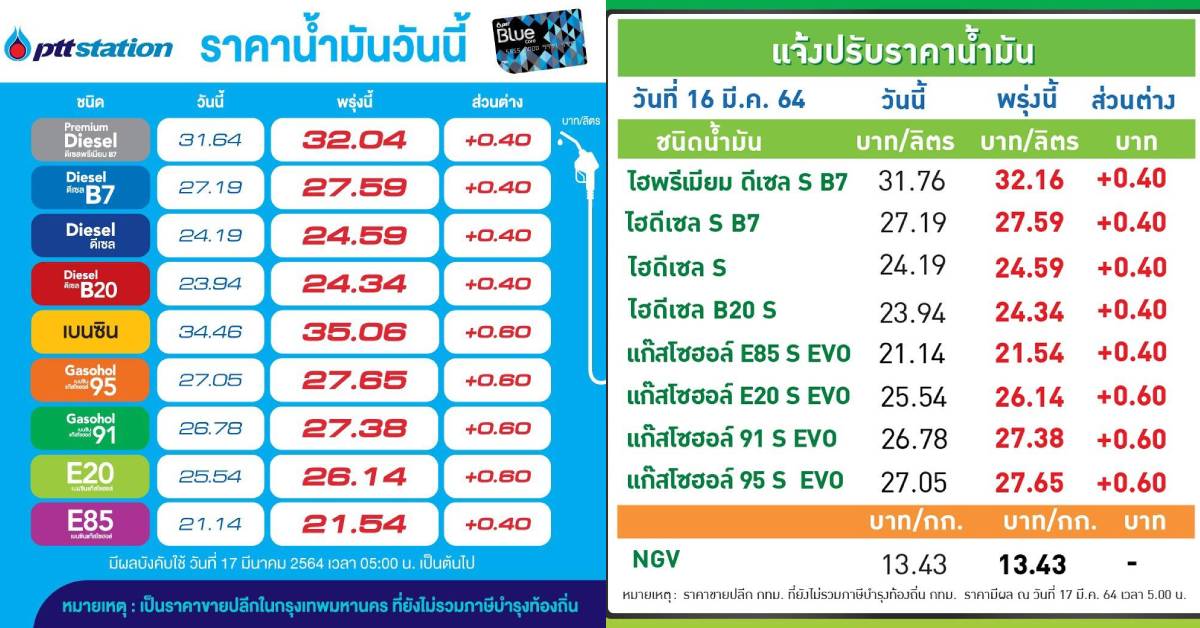 กทม. 16 มี.ค.-ปตท. บางจากฯ ปรับราคาขายปลีกน้ำมันกลุ่มเบนซินและแก๊สโซฮอล์ทุกชนิดขึ้น 60 สตางค์/ลิตร เว้น E85 ปรับขึ้น 40 สตางค์/ลิตร ส่วนกลุ่มดีเซลทุกชนิด ปรับขึ้น 40 สตางค์/ลิตร มีผล 17 มี.ค.64 เวลา 05.00 น. เป็นต้นไป