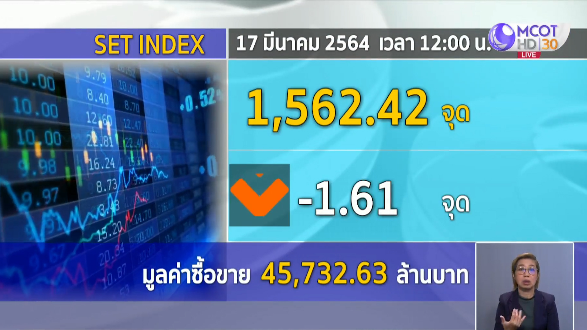 กรุงเทพฯ 17 มี.ค.-หุ้นไทยแกว่งตัวแคบๆ ล่าสุด เคลื่อนไหว 1,562.42 จุด ลบ -1.61 จุด มูลค่าการซื้อขาย 45,732.63 ล้านบาท โดยรอผลผลประชุมธนาคารกลางสหรัฐฯ (เฟด) ซึ่งจะมีการแถลงในวันนี้ตามเวลาสหรัฐ หรือในช่วงเช้าตรู่ของวันพรุ่งนี้ตามเวลาไทย
