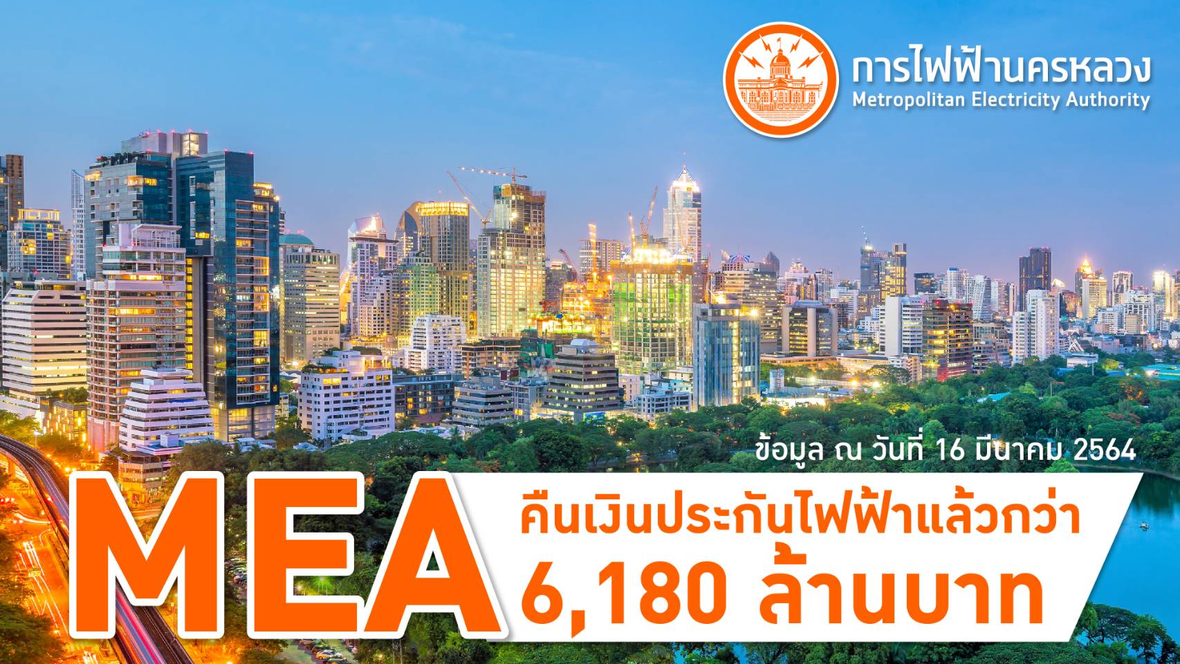 กรุงเทพฯ 19 มี.ค.- ผู้สื่อข่าวรายงานว่า ภายหลัง การไฟฟ้านครหลวง หรือ MEA ได้เปิดให้ลงทะเบียนขอคืนเงินประกันการใช้ไฟฟ้า ตั้งแต่วันที่ 25 มีนาคม 2563 เป็นต้นมานั้น ล่าสุดข้อมูล ณ วันที่ 16 มีนาคม 2564 มีผู้ได้รับเงินแล้วทั้งสิ้นประมาณ 2.29 ล้านรายการ คิดเป็นจำนวนเงินทั้งสิ้น 6,180 ล้านบาท