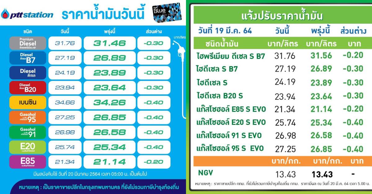 ยราคาขายปลีกจะเป็นดังนี้ เบนซิน ราคา 34.26 , แก๊สโซฮอล์95 ราคา 26.85, E20 ราคา 25.34, แก๊สโซฮอล์91 ราคา 26.58, E85 ราคา 21.14, ดีเซล-B7 ราคา 26.89, ดีเซล ราคา 23.89, ดีเซล-B20 ราคา 23.64, ดีเซลพรีเมี่ม B7 ราคา 31.46 บาทต่อลิตร โดยราคาขายปลีกข้างต้นยังไม่รวมภาษีบำรุงกรุงเทพมหานคร.-สำนักข่าวไทย