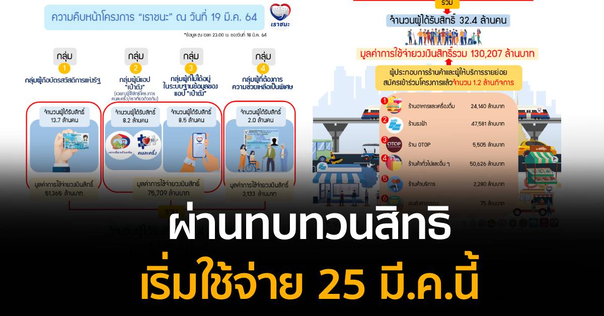 กทม. 19 มี.ค.-คลัง ย้ำผู้ผ่านทบทวนสิทธิ “เราชนะ” เริ่มใช้จ่าย 25 มี.ค.นี้ ล่าสุดโครงการเราชนะใช้จ่ายแล้ว 1.3 แสนล้านบาท