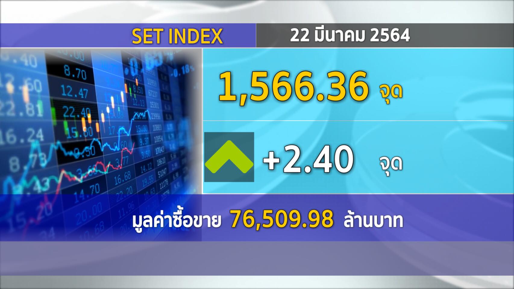 กรุงเทพฯ 22 มี.ค.-ตลาดหุ้นไทยปิดบวก 2.40 จุด ตลาดแข็งแกร่งได้แรงดันจากหุ้นขนาดเล็กแม้ไร้ปัจจัยใหม่