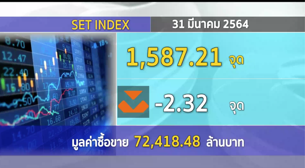 กทม. 31 มี.ค.-ตลาดหลักทรัพย์ปิดวันนี้ที่ระดับ 1,587.21 จุด ลดลง 2.32 จุด (-0.15%) มูลค่าการซื้อขาย 72,418.48 ล้านบาท พักตัวจากแรงกดดันจาก Bond yield ขึ้นสูง-ดอลลาร์แข็งค่า