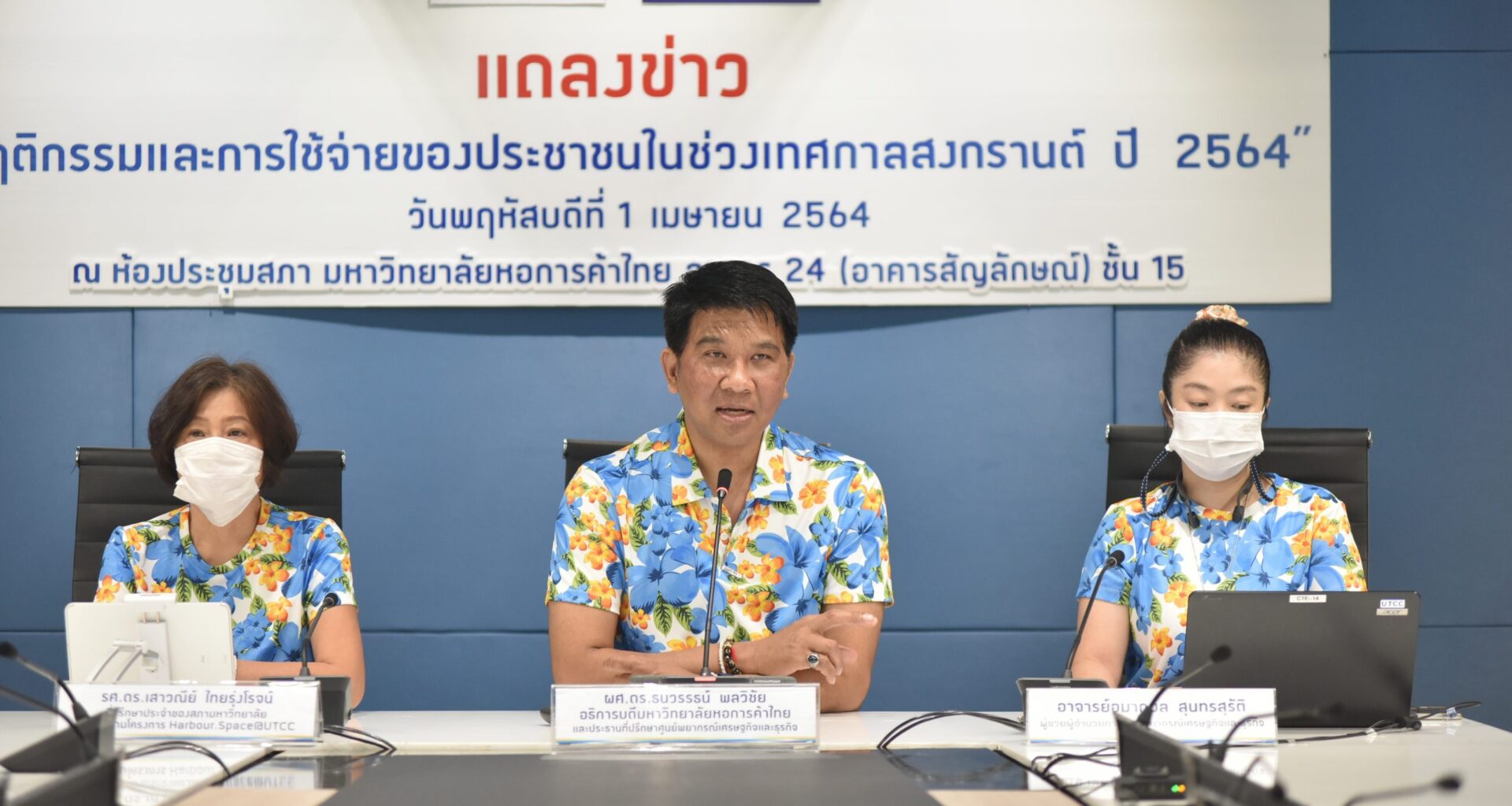 นางเสาวณีย์ ไทยรุ่งโรจน์ ที่ปรึกษาประจำของสภามหาวิทยาลัยหอการค้าไทย รายงานพฤติกรรมการใช้จ่ายของผู้บริโภคในช่วงเทศกาลสงกรานต์ จาก 1,256 กลุ่มตัวอย่าง พบว่า ส่วนใหญ่ยังตั้งใจที่จะทำบุญเฉลี่ยคนละ 2,000 บาท ทำอาหารที่บ้านคนละ 1,550 บาท ไปเยี่ยมญาติรดน้ำดำหัวผู้ใหญ่ เฉลี่ยใช้จ่ายคนละ 5,300 บาท การเลี้ยงสังสรรค์ เฉลี่ยคนละ 2,100 บาท และส่วนใหญ่ร้อยละ 64.7 ยังจะเดินทางท่องเที่ยว เนื่องจากได้รับอานิสงส์จากโครงการภาครัฐ ประชาชนมากกว่าร้อยละ 97 ตั้งใจจะใช้เงินจากนโยบายภาครัฐ ซึ่งจะใช้จ่ายเฉลี่ยคนละ 5,180 บาท แต่ส่วนใหญ่จะไปแบบเช้า-เย็นกลับ ทำให้ประมาณการณ์ว่า ในช่วงเทศกาลสงกรานต์ จะมีเงินสะพัด 112,867 ล้านบาท หดตัวร้อยละ 16.9 เมื่อเทียบกับปี 2562 เนื่องจากคนยังกังวลสถานการณ์โควิด-19 ที่จะส่งผลต่อเศรษฐกิจโดยรวม โดยประชาชนกว่าร้อยละ 57 ยังเชื่อว่าเศรษฐกิจไทยในปีนี้จะขยายตัวต่ำกว่าร้อยละ 3 ซึ่งหากรัฐบาลจะเปิดรับนักท่องเที่ยวต่างชาติเข้ามา แม้จะเป็นการสร้างรายได้เข้าประเทศ แต่ประชาชนกว่าร้อยละ 68 ยังไม่เห็นด้วยกับการเปิดรับนักท่องเที่ยวต่างชาติ เพราะควรจะฉีดวัคซีนให้คนในประเทศในเกณฑ์ที่เหมาะสมก่อน