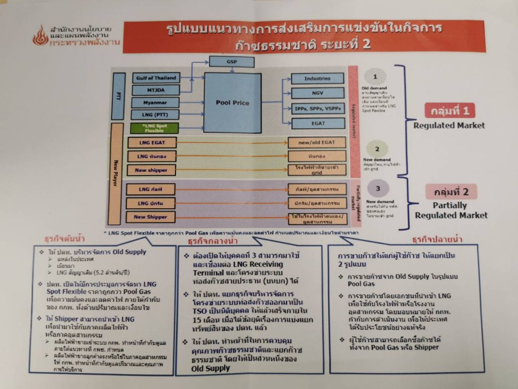 1) กลุ่มภายใต้การกำกับดูแลของ กกพ. ตามแนวทางที่คณะกรรมการบริหารนโยบายพลังงาน (กบง.) และ กพช. กำหนด (Regulated Market) ประกอบด้วย ผู้ใช้ก๊าซธรรมชาติจากตลาดเก่า( Old Supply) และผู้นำเข้า ( Shipper) ที่จัดหาก๊าซธรรมชาติเหลว ( LNG )เพื่อนำมาใช้กับภาคไฟฟ้าที่ขายเข้าระบบ ซึ่งในกลุ่มนี้จะประกอบไปด้วย บมจ.ปตท.,การไฟฟ้าฝ่ายผลิตแห่งประเทศไทย (กฟผ.) และโรงไฟฟ้าหินกอง โดยก๊าซธรรมชาติ ส่วนนี้จะมาจากแหล่งในประเทศ (รวมพื้นที่พัฒนาร่วม ไทย-มาเลเซีย : JDA) แหล่งจากเมียนมา และ LNG ที่นำเข้าสัญญาระยะยาว ที่ปตท.ทำไว้แล้ว (5.2 ล้านตัน/ปี) รวมทั้งกำหนดให้ก๊าซในอ่าวไทยต้องนำมาใช้ในโรงแยกก๊าซก่อน และให้ ปตท. เปิดประมูล LNG Spot Flexible ราคาถูกกว่า Pool Gas ภายใต้กำกับ ของ กกพ. ทั้งด้านปริมาณและเงื่อนไข ซึ่งจะทำให้ ค่าไฟฟ้าทั้งระบบมีราคาต่ำลง เป็นประโยชน์ต่อประชาชน