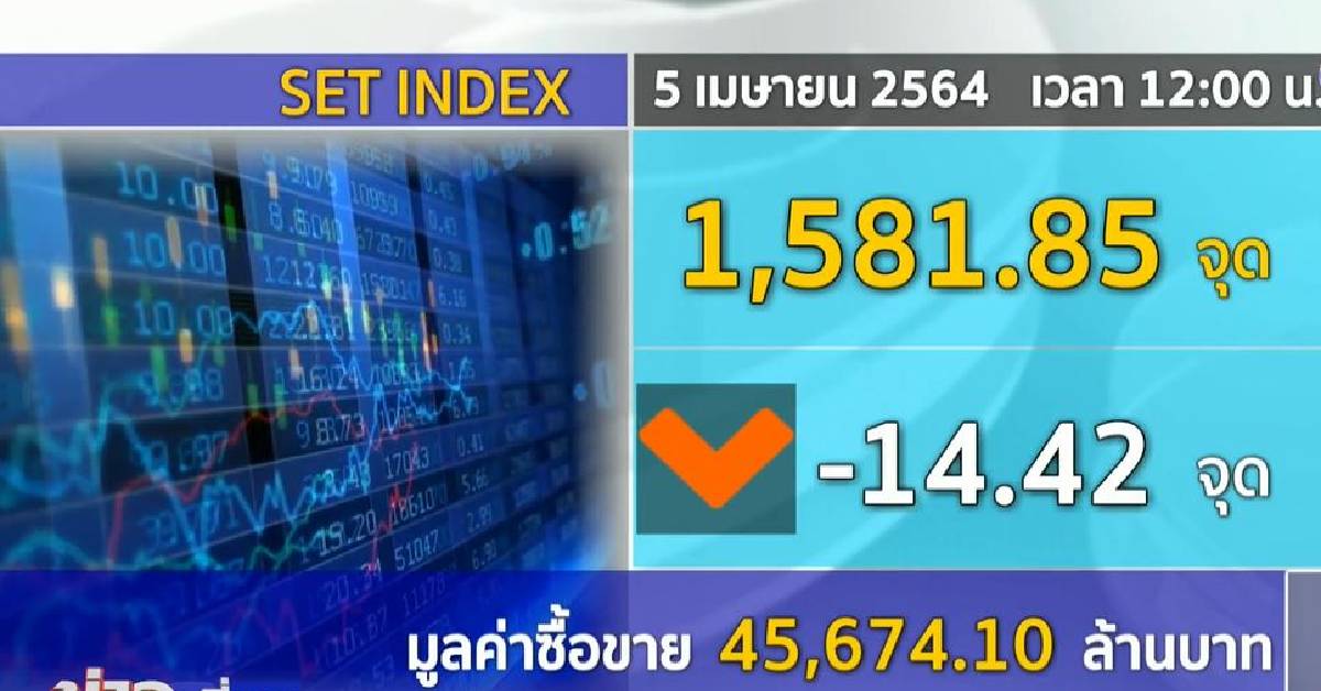กทม. 5 เม.ย.-หุ้นไทยภาคเช้า ตลาดผันผวนยืนในแดนบวกและลบ สลับกัน แม้มีแรงซื้อตอบรับเศรษฐกิจสหรัฐฟื้นตัว แต่มีแรงขายกดดันจากบอนด์ยีลด์ทรงตัวระดับสูง และตัวเลขผู้ติดเชื้อไวรัสโควิดที่เพิ่มขึ้นต่อเนื่อง ล่าสุด ดัชนี้ช่วงเที่ยงอยู่ที่ 1,581.85 จุด ลดลง 14.42 จุด มูลค่าซื้อขาย 45,674.10 ล้านบาท