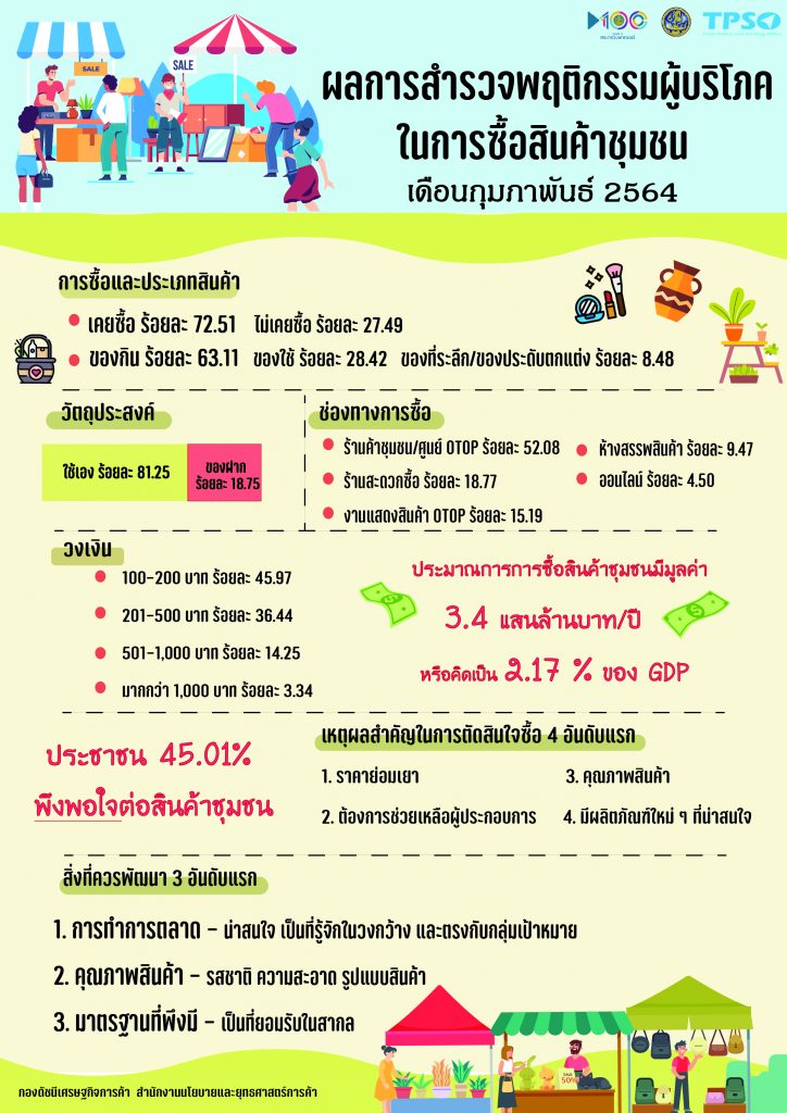 • ประเภทสินค้าที่ซื้อ ผลการสำรวจพบว่า ของกินได้รับความนิยมมากที่สุด ร้อยละ 63.11 รองลงมา ของใช้ ร้อยละ 28.42 และของที่ระลึก/ประดับตกแต่ง ร้อยละ 8.48 โดยเหตุผลหลักที่ทำให้ซื้อสินค้าชุมชน ได้แก่ ราคาย่อมเยา ต้องการช่วยเหลือผู้ประกอบการ ถือเป็นการกระจายรายได้ให้กับชุมชน และสินค้ามีคุณภาพ (อาทิ สินค้าออแกนิกส์ ปลอดภัย และรสชาติดี) ขณะที่สินค้าประเภทของที่ระลึก/ประดับตกแต่ง นอกจากเหตุผลข้างต้นแล้ว ประชาชนให้เหตุผลเพิ่มเติมว่าสินค้ามีความเป็นอัตลักษณ์เฉพาะท้องที่ และมีบรรจุภัณฑ์สวยงาม