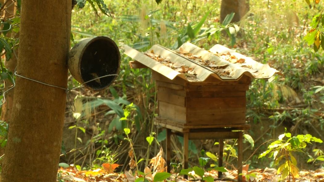 สวนยางพาราที่บ้านทุ่งกล้วยในอำเภอภูซาง จังหวัดพะเยา เริ่มผลัดใบในหน้าแล้ง ชาวสวนหยุดกรีดเพื่อให้ต้นยางพักตัว แต่ชาวสวนยางพาราที่นี่ ยังมีรายได้เสริมจากการเลี้ยงผึ้งโพรงในสวนยาง อย่างพี่ไพบูลย์ เจ้าของสวนยางแห่งนี้ที่วางกล่องเลี้ยงผึ้งโพรง ไว้ในสวนยางกว่า 10 กล่อง บางกล่องเริ่มมีรังผึ้งเต็มแล้ว แกะกล่องนำน้ำผึ้งขายในราคากิโลกรัมละ 150 บาท กล่องหนึ่งจะได้ 7-15 กิโลกรัมแล้วแต่ช่วง แต่ส่วนใหญ่จะเก็บในเดือน 5 ซึ่งเป็นช่วงที่น้ำผึ้งหวานที่สุด