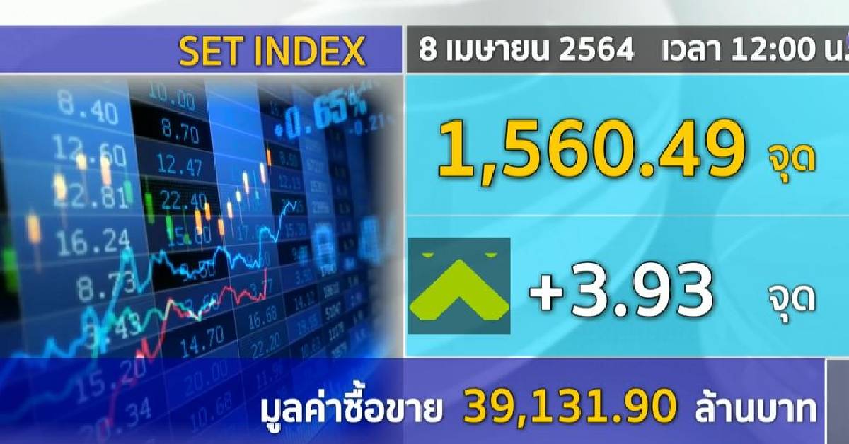 กทม. 8 เม.ย.-ดัชนีหุ้นไทยช่วงเที่ยงอยู่ที่ 1,560.49 จุด บวก 3.93 จุด มูลค่าซื้อขาย 39,131.90 ล้านบาท
