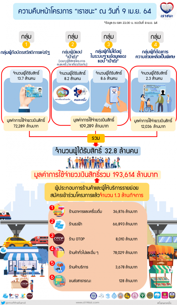 โฆษกกระทรวงการคลังได้แถลงเพิ่มเติมถึงความคืบหน้าของโครงการฯ ณ วันที่ 9 เมษายน 2564 ดังนี้ 1) ประชาชนกลุ่มผู้ถือบัตรสวัสดิการแห่งรัฐ จำนวน 13.7 ล้านคน ได้มีการใช้จ่ายตั้งแต่วันที่ 5 กุมภาพันธ์ 2564 เป็นต้นมา จำนวน 72,289 ล้านบาท 2) ประชาชนกลุ่มที่อยู่ในระบบฐานข้อมูลของแอปพลิเคชัน “เป๋าตัง” ในโครงการเราเที่ยวด้วยกันและคนละครึ่ง และกลุ่มประชาชนทั่วไปที่ลงทะเบียนทางเว็บไซต์ www.เราชนะ.com ที่ผ่านการคัดกรองคุณสมบัติเบื้องต้นและยืนยันการใช้สิทธิร่วมโครงการฯ แล้ว จำนวน 16.8 ล้านคน และมีการใช้จ่ายวงเงินสิทธิสะสมตั้งแต่วันที่ 18 กุมภาพันธ์ 2564 เป็นต้นมา จำนวน 109,289 ล้านบาท และ 3) ประชาชนกลุ่มผู้ที่ต้องการความช่วยเหลือเป็นพิเศษที่ผ่านการคัดกรองคุณสมบัติแล้ว จำนวน 2.3 ล้านคน มียอดใช้จ่ายวงเงินสิทธิ์สะสมตั้งแต่วันที่ 5 มีนาคม 2564 เป็นต้นมา จำนวน 12,036 ล้านบาท ทำให้มีผู้ได้รับสิทธิในโครงการฯ แล้ว รวมทั้งสิ้นจำนวน 32.8 ล้านคน คิดเป็นมูลค่าการใช้จ่ายหมุนเวียนในระบบเศรษฐกิจไทยแล้วกว่า 193,614 ล้านบาท ซึ่งเป็นการใช้จ่ายผ่านผู้ประกอบการร้านธงฟ้าราคาประหยัดพัฒนาเศรษฐกิจท้องถิ่นที่มีแอปพลิเคชัน “ถุงเงิน” ร้านค้าคนละครึ่งที่ตกลงยินยอมเข้าร่วมโครงการฯ รวมถึงผู้ประกอบการร้านค้าและผู้ให้บริการที่ลงทะเบียนเข้าร่วมโครงการฯ จำนวนทั้งสิ้นมากกว่า 1.3 ล้านกิจการ