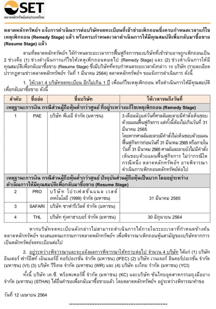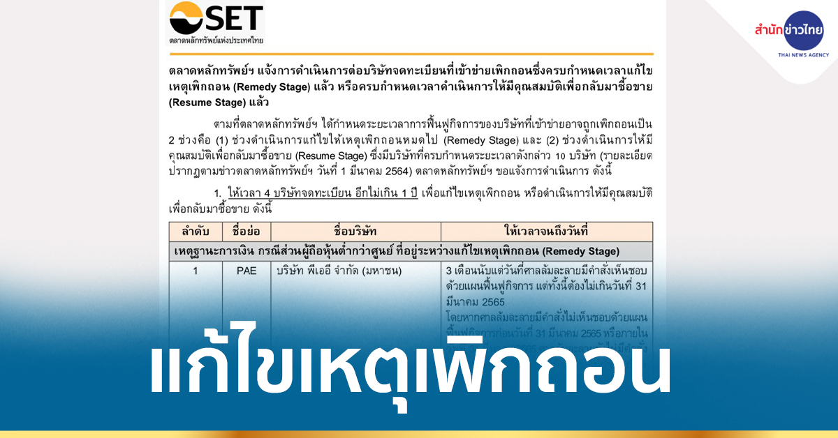 - ให้เวลา 4 บริษัทจดทะเบียนอีกไม่เกิน 1 ปีเพื่อแก้ไขเหตุเพิกถอนหรือดำเนินการให้มีคุณสมบัติเพื่อกลับมาซื้อขาย โดยแบ่งเป็นเหตุฐานะการเงิน กรณีส่วนผู้ถือหุ้นต่ำกว่าศูนย์ที่อย่รูะหว่างแก้ไขเหตุเพิกถอน (Remedy Stage) ได้แก่ บริษัท พีเออี จำกัด (มหาชน) หรือ PAE ซึ่งมีระยะเวลา 3 เดือนนับแต่วันที่ศาลล้มละลายมีคำสั่งเห็นชอบ ด้วยแผนฟื้นฟูกิจการ แต่ทั้งนี้ต้องไม่เกินวันที่31มี.ค.65 โดยหากศาลล้มละลายมีคำสั่งไม่เห็นชอบด้วยแผนฟื้นฟูกิจการก่อนวันที่31 มี.ค.65 หรือภายในวันที่31 มี.ค.65 ศาลล้มละลายยังไม่มีคำสั่งเห็นชอบด้วยแผนฟื้นฟูกิจการไม่ว่ากรณีใดกรณีหนึ่ง ตลท.อาจพิจารณาดำเนินการเพิกถอนหลักทรัพย์ต่อไป