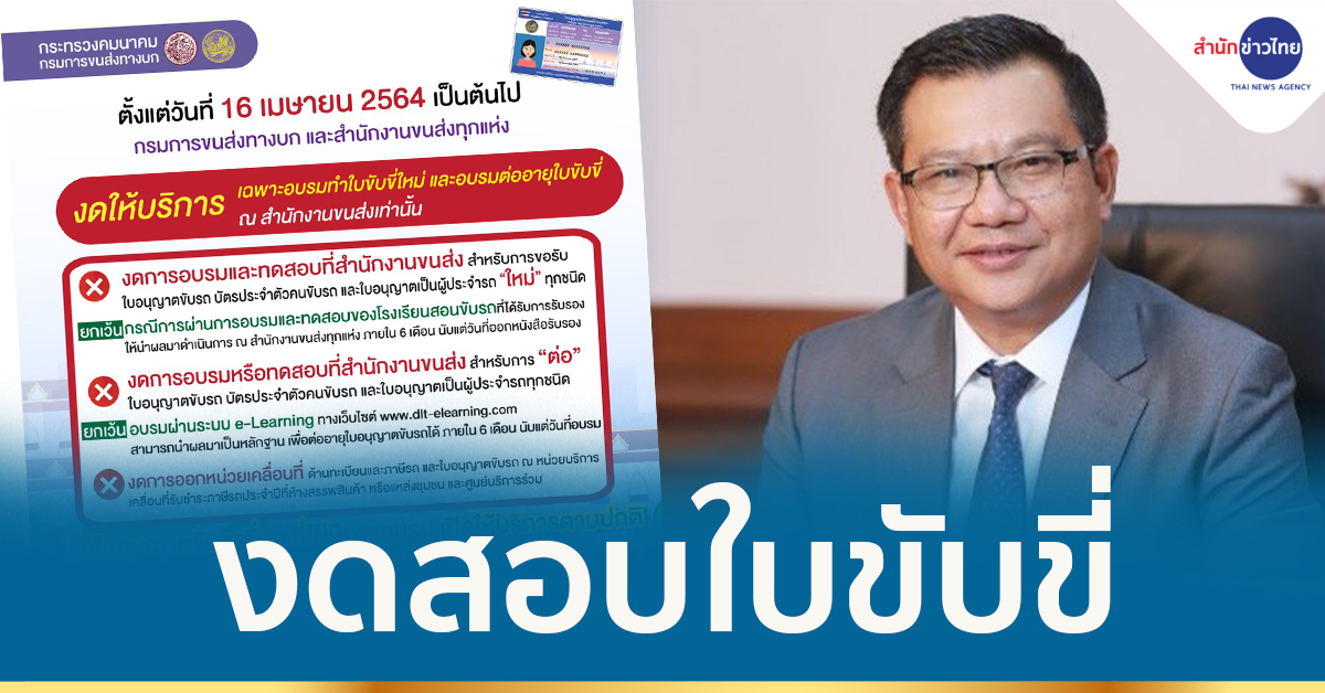 นายจิรุตม์ วิศาลจิตร อธิบดีกรมการขนส่งทางบก เปิดเผยว่า จากสถานการณ์การพบผู้ติดเชื้อไวรัสโคโรนา 2019 (โควิด-19) ซึ่งมีการแพร่ระบาดเป็นวงกว้างเกิดขึ้นในหลายจังหวัดของประเทศไทย เพื่อเป็นการป้องกันไม่ให้เกิดการแพร่ระบาดโรคติดเชื้อดังกล่าวเพิ่มมากขึ้น ขนส่งทางบก จึงจำเป็นต้องงดการอบรมด้านใบอนุญาตขับรถ ณ สำนักงานขนส่งทุกแห่งทั่วประเทศ ตั้งแต่วันที่ 16 เมษายน 64 เป็นต้นไป จนกว่าจะมีประกาศเปลี่ยนแปลง โดยมีกิจกรรมที่งดให้บริการดังนี้
