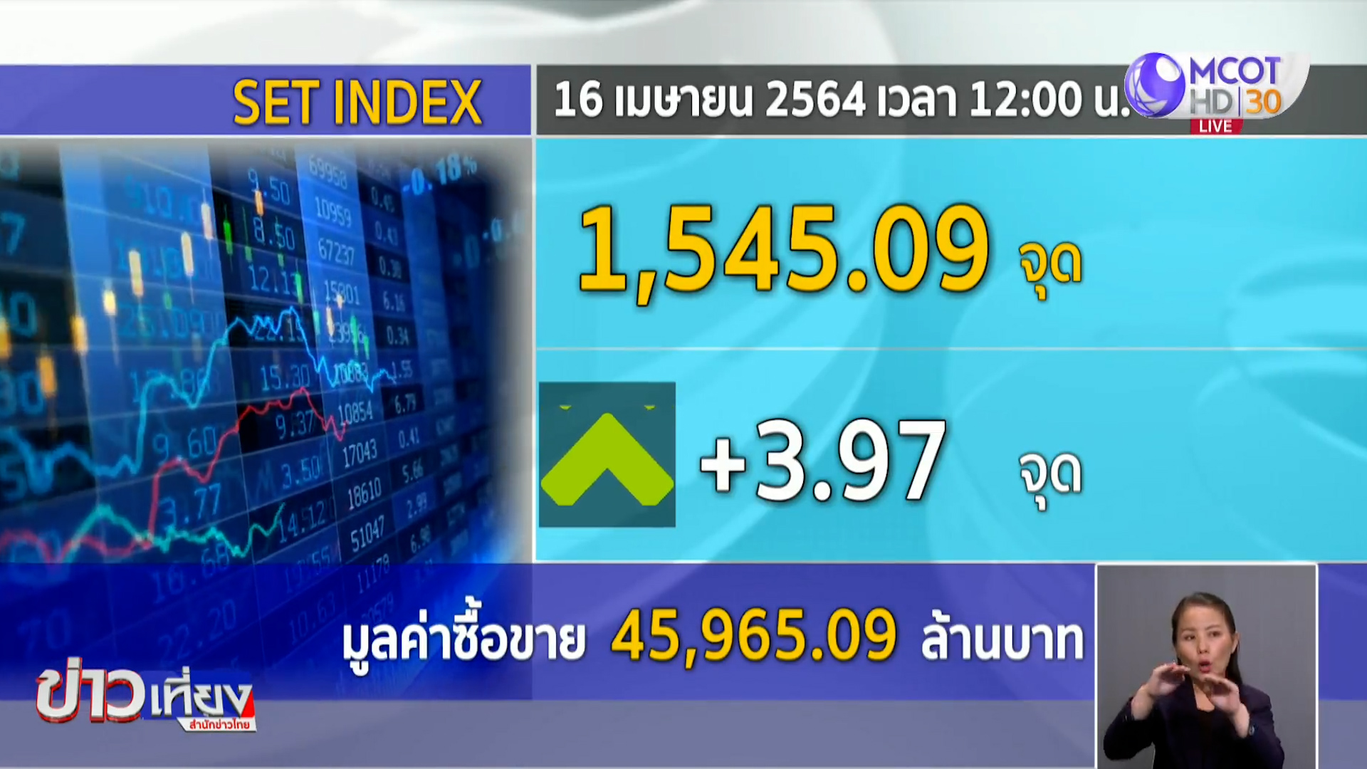 16 เม.ย.-ดัชนีหุ้นไทยช่วงเช้า เปิดอ่อนตัวลงกว่า 10 จุด จากความกังวลโควิด-19 กลับมาระบาดสูง อย่างไรก็ตาม ล่าสุดหุ้นกลับมาเป็นบวก นักลงทุนติดตามการประชุม ศบค.ช่วงบ่ายวันนี้