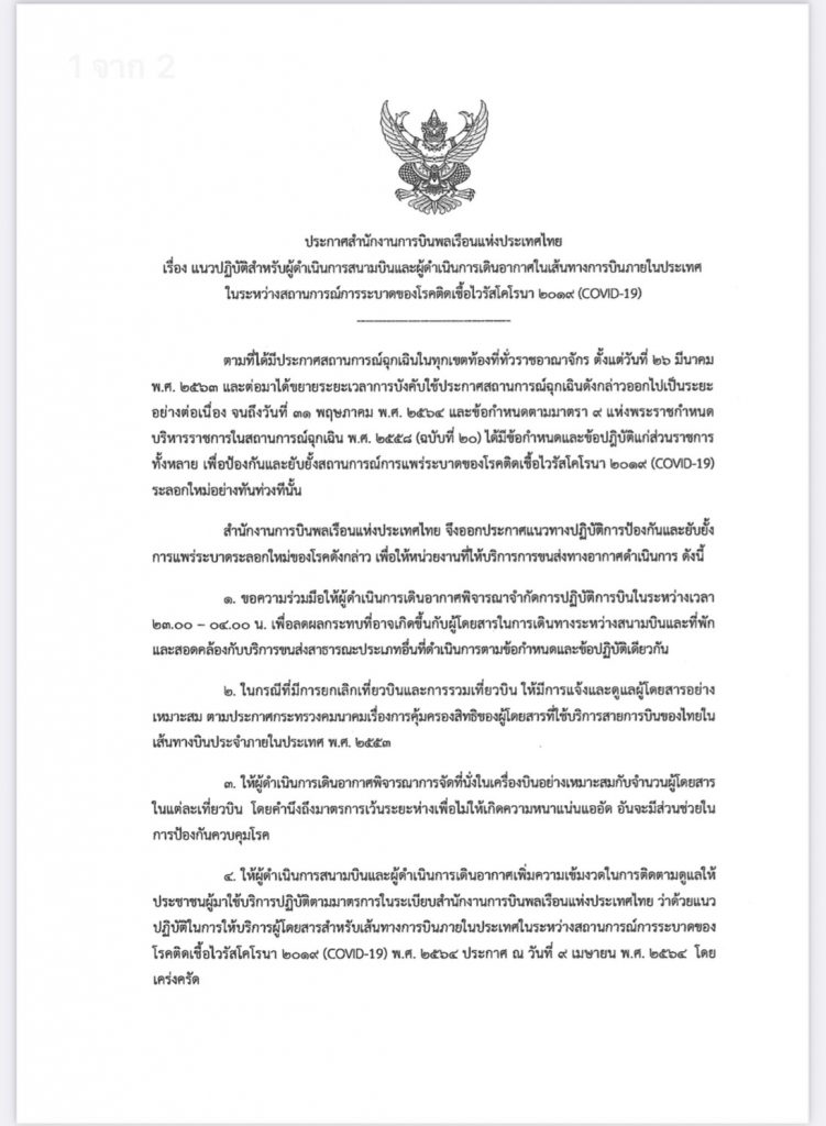 4.ให้ผู้ดำเนินการสนามบินและผู้ดำเนินการเดินอากาศ เพิ่มความเข้มงวดในการติดตามดูแลให้ประชาชนผู้มาใช้บริการปฏิบัติตามมาตรการในระเบียบสำนักงานการบินพลเรือนแห่งประเทศไทย ว่าด้วยแนวทางปฏิบัติในการให้บริการผู้โดยสารสำหรับเส้นทางดการบินภายในประเทศในระหว่างสถานการณ์การระบาดของโรคติดเชื้อไวรัสโควิด-19