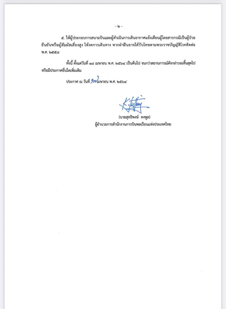 5.ให้ผู้ดำเนินการสนามบินและผู้ดำเนินการเดินอากาศ แจ้งเตือนผู้โดยสารกรณีเป็นผู้ป่วยยืนยันหรือผู้สัมผัสเสี่ยงสูง ให้งดเดินทาง หากฝ่าฝืนอาจได้รับโทษตามพ.ร.บ.โรคติดต่อพ.ศ.2558 โดยให้มีผลบังคับใช้ตั้งแต่วันนี้ (18 เม.ย.) เป็นต้นไป