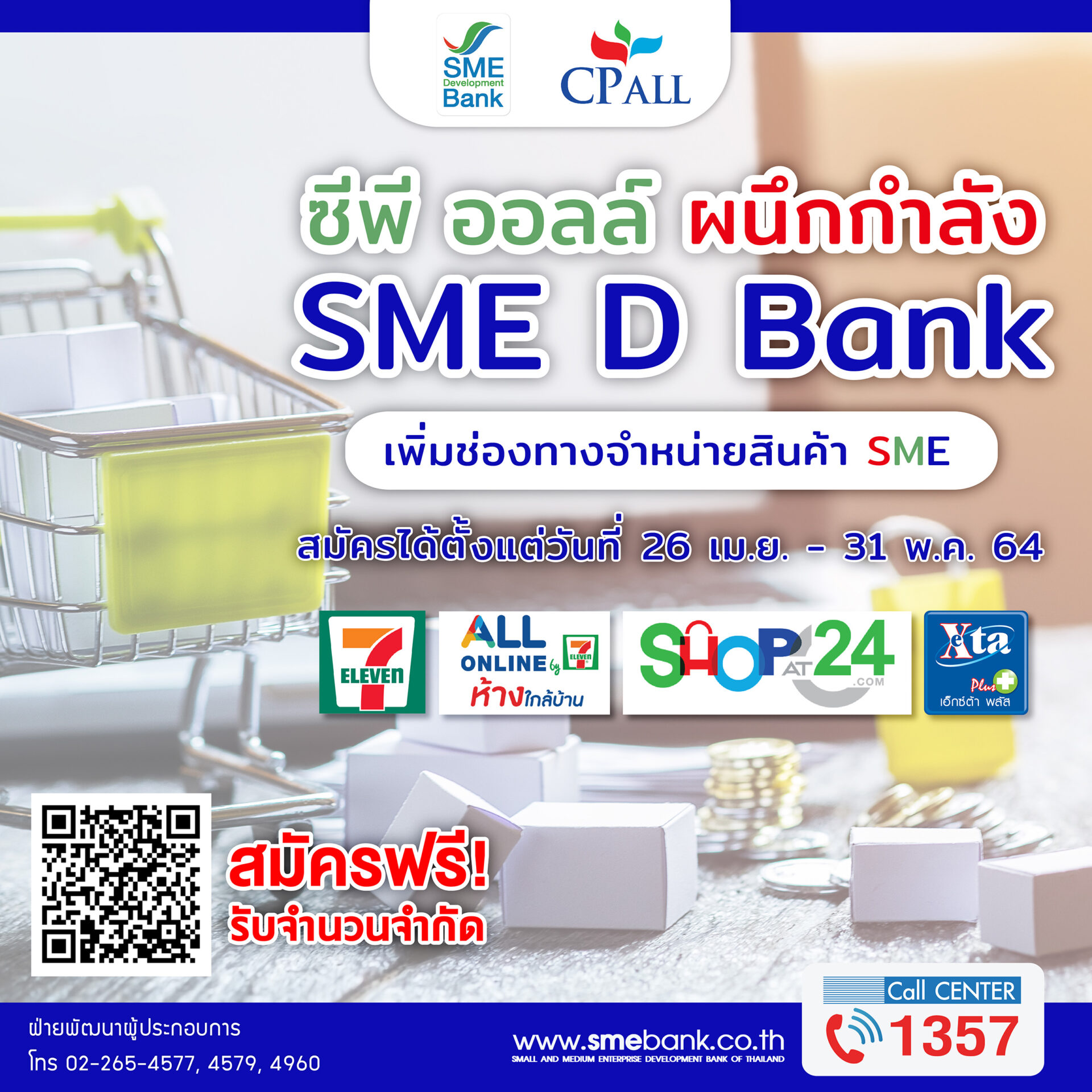 นางสาวนารถนารี รัฐปัตย์ กรรมการผู้จัดการ ธนาคารพัฒนาวิสาหกิจขนาดกลางและขนาดย่อมแห่งประเทศไทย (ธพว.) หรือ SME D Bank เปิดเผยว่า จากสถานการณ์แพร่ระบาดของโรคโควิด-19 ส่งผลกระทบต่อผู้ประกอบการเอสเอ็มอีไทยอย่างรุนแรง ธนาคารในฐานะสถาบันการเงินของรัฐเพื่อเอสเอ็มอีไทย จึงร่วมมือกับบริษัท ซีพี ออลล์ จำกัด (มหาชน) จัดโครงการ “เพิ่มช่องทางจำหน่ายสินค้า SME” สร้างโอกาสให้กับผู้ประกอบการเอสเอ็มอีที่เป็นลูกค้า SME D Bank และผู้ประกอบการที่สนใจ ทั้งกลุ่มบุคคลธรรมดา และนิติบุคคล เข้าคัดเลือกนำสินค้าจำหน่ายผ่านช่องทางตลาดต่าง ๆ ของซีพี ออลล์ ทั้งออฟไลน์และออนไลน์ ไม่ว่าจะเป็นร้านเซเว่นอีเลฟเว่น (7-11) ทั่วประเทศ , All Online , ทเวนตี้โฟร์ ช้อปปิ้ง และร้านยา เอ็กซ์ต้า พลัส