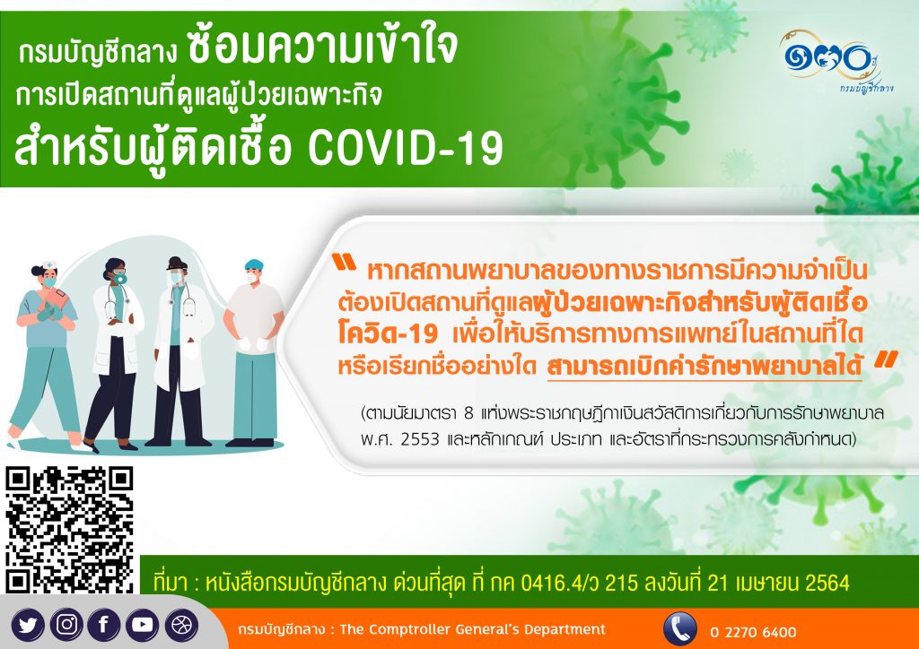 นายประภาศ คงเอียด อธิบดีกรมบัญชีกลาง กล่าวว่า ตามที่สถานการณ์การแพร่ระบาดระลอกใหม่ของโรคติดเชื้อไวรัสโคโรนา 2019 (โควิด-19) มีจำนวนผู้ติดเชื้อเพิ่มขึ้นอย่างต่อเนื่อง ส่งผลให้สถานพยาบาล ของทางราชการไม่เพียงพอต่อการดูแลรักษาผู้ป่วย และมีสถานพยาบาลหลายแห่งได้ขอหารือเกี่ยวกับกรณีเปิดสถานที่ดูแลผู้ป่วยเฉพาะกิจ เพื่อรองรับผู้ป่วยที่ติดเชื้อโควิด-19 ว่าสามารถขอใช้สิทธิเบิกค่ารักษาพยาบาลได้หรือไม่ กรมบัญชีกลางได้พิจารณาตามพระราชกฤษฎีกาเงินสวัสดิการเกี่ยวกับการรักษาพยาบาล พ.ศ. 2553 และที่แก้ไขเพิ่มเติม มาตรา 8 วรรคหนึ่ง (1) และวรรคสอง ที่กำหนดให้ผู้มีสิทธิได้รับเงินสวัสดิการเกี่ยวกับการรักษาพยาบาลสำหรับตนเองหรือบุคคลในครอบครัวของตน กรณีเข้ารับการรักษาพยาบาลในสถานพยาบาลของทางราชการ ทั้งประเภทผู้ป่วยนอกและผู้ป่วยใน โดยให้เป็นไปตามหลักเกณฑ์ ประเภทและอัตราที่กระทรวงการคลังกำหนด ซึ่งตามหลักเกณฑ์และอัตราค่ารักษาพยาบาลประเภทผู้ป่วยนอกและผู้ป่วยในสถานพยาบาลของทางราชการ กรณีผู้มีสิทธิหรือบุคคลในครอบครัวเสี่ยงหรือติดเชื้อไวรัสโคโรนา 2019 ไม่ได้กำหนดเงื่อนไขเกี่ยวกับการขึ้นทะเบียนสถานพยาบาลของทางราชการหรือสถานที่ดูแลผู้ป่วยเฉพาะกิจสำหรับผู้ติดเชื้อโควิด-19 ไว้ ประกอบกับการดำเนินการในเรื่องดังกล่าว เป็นอำนาจการบริหารจัดการของสถานพยาบาลของทางราชการ
